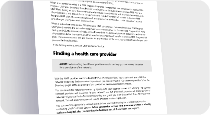 Providers who join UMP Plus agree to deliver and evaluate the quality of your care. When you receive covered preventive care and coordinated care, the overall cost of providing care is lower. These cost savings help keep your premium and deductible lower without limiting necessary care. Accumulators Insurance accumulators may transfer when a subscriber changes their enrollment from one UMP plan to another UMP plan mid-year during a special open enrollment (SOE). When a subscriber enrolled in a PEBB Program UMP plan changes their own enrollment to another PEBB Program UMP plan (meaning the subscriber continues to be the subscriber on the new PEBB Program UMP Plan) during an SOE, the amounts already accrued toward medical and pharmacy deductibles, out- of-pocket limits, and benefit limits (see definition of “Limited benefit”) will transfer to the new PEBB Program UMP plan. These accumulators will also transfer for any member on the subscriber’s account who changes UMP plans with the subscriber. When a subscriber enrolled in a SEBB Program UMP plan changes their enrollment to a PEBB Program UMP plan (meaning the subscriber continues to be the subscriber on the new PEBB Program UMP Plan) during an SOE, the amounts already accrued toward the medical and pharmacy deductibles and the out- of-pocket limits for themselves and their enrolled dependents will transfer to the new PEBB Program UMP plan. These accumulators will also transfer for any member on the subscriber’s account who changes UMP plans with the subscriber. If you have questions, contact UMP Customer Service. Finding a health care provider ALERT! Understanding the different provider networks can help you save money. See below for a description of the networks. Visit the UMP provider search to find UMP Plus–PSHVN providers. You can also visit your UMP Plus network website to find core network providers (see the definition of “Core network providers”). See the Directory pages at the beginning of this booklet for links and contact information. You can search for network providers by signing in to your Regence account and selecting Find a Doctor. Network providers will display as "In your network" and out-of-network providers will display as "Out of network." If you use Find a Doctor by searching as a guest, you must choose UMP Plus– PSHVN as your network. This will ensure your search results only return network providers. You can confirm a provider’s network status before your visit by using the provider search tool or contacting UMP Customer Service. Before you receive services from a network provider at a facility such as a hospital, also confirm that the facility is part of the network (see page 21). UMP Plus–PSHVN ALERT! Some providers are network providers at one location but not another (example: urgent care clinics). Contact UMP Customer Service if you have any questions about the network status of a provider at a specific location. 2024 UMP Plus–PSHVN (PEBB) Certificate of Coverage 15