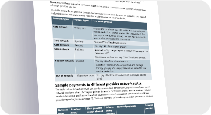 How much you will pay You do not pay anything for a primary care office visit when you see your primary care provider in the core network. However, related services, like x-rays or labs you may receive during a primary care visit, may be subject to your medical deductible and coinsurance. You pay 15 percent of the allowed amount when you see other providers in the core or support network. If you see an out-of-network provider, you will pay 50 percent of the allowed amount, plus any amount the provider charges above the allowed amount (called balance billing). Note: You will have to pay for services or supplies that are not covered or exceed benefit limits, regardless of which provider you see. The table below shows provider types and what you pay to see them. Services are subject to your medical deductible unless otherwise noted. Read the sections below the table for details. Network types Provider types How much you pay Core network Primary care You pay 0% for primary care office visits. Not subject to your medical deductible. Related services (like x-rays or labs) that you may receive during a primary care visit may be subject to your medical deductible and coinsurance Core network Specialty You pay 15% of the allowed amount. Core network Support You pay 15% of the allowed amount. Core network Facilities Inpatient facility charges: Inpatient copay $200 per day, annual maximum $600. Professional services: You pay 15% of the allowed amount. Support network Support You pay 15% of the allowed amount. Exception: For chiropractic, acupuncture, and massage therapy, you pay a $15 copay per visit, not subject to your medical deductible. Out of network All provider types You pay 50% of the allowed amount and may be balance billed. Sample payments to different provider network status The table below shows how much you pay for services from core network, support network, and out-of- network providers when UMP is your primary insurance. For these examples, assume you have met your medical deductible and have not reached your medical out-of-pocket limit. See descriptions of these provider types beginning on page 15. These are examples only and may not reflect your specific situation. Network Provider Must provider Balance Itemized payments You owe type type/ accept allowed billing provider service amount? allowed? Core PCP office Yes. You pay No Billed charge: $200 $0 network visit none of the Allowed amount: $150 allowed amount Plan pays 100%: $150 (coinsurance). You pay: $0 22 2024 UMP Plus–PSHVN (PEBB) Certificate of Coverage
