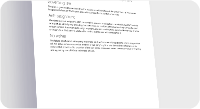 connected with injuries you may suffer while receiving health services or supplies provided by professionals who are neither employees nor agents of either UMP or Regence BlueShield. Neither Regence BlueShield nor UMP is responsible for the quality of health care you receive, except as provided by law. In addition, UMP will not be liable to any person or entity for the inability or failure to procure or provide the benefits of the plan by reason of epidemic, disaster, or other cause or condition beyond UMP’s control. Governing law The plan is governed by and construed in accordance with the laws of the United States of America and by applicable laws of Washington State without regard to its conflict of law rules. Anti-assignment Members may not assign this COC, or any rights, interests or obligations contained in this COC, in whole or in part, to a third party (including, but not limited to, providers of medical services), without the plan’s written consent. Any attempt to assign any rights, interests or obligations contained in this COC, in whole or in part, to a third party is void and/or invalid, and the plan will not recognize it. No waiver The failure or refusal of either party to demand strict performance of the plan or to enforce any provision will not act as or be construed as a waiver of that party’s right to later demand its performance or to enforce that provision. No provision of the plan will be considered waived unless such waiver is in writing and signed by one of HCA’s authorized officers. 138 2024 UMP Plus–PSHVN (PEBB) Certificate of Coverage