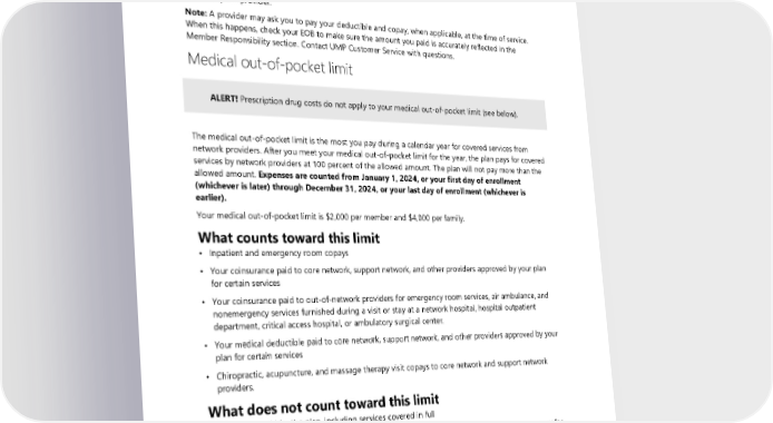 When you pay Most of the time, you pay after your claim is processed. • You will receive an Explanation of Benefits (EOB) from the plan that explains how much the plan paid the provider. The Member Responsibility section of your EOB tells you how much you owe the provider. • The provider sends you a bill. • You pay the provider. Note: A provider may ask you to pay your deductible and copay, when applicable, at the time of service. When this happens, check your EOB to make sure the amount you paid is accurately reflected in the Member Responsibility section. Contact UMP Customer Service with questions. Medical out-of-pocket limit ALERT! Prescription drug costs do not apply to your medical out-of-pocket limit (see below). The medical out-of-pocket limit is the most you pay during a calendar year for covered services from network providers. After you meet your medical out-of-pocket limit for the year, the plan pays for covered services by network providers at 100 percent of the allowed amount. The plan will not pay more than the allowed amount. Expenses are counted from January 1, 2024, or your first day of enrollment (whichever is later) through December 31, 2024, or your last day of enrollment (whichever is earlier). Your medical out-of-pocket limit is $2,000 per member and $4,000 per family. What counts toward this limit • Inpatient and emergency room copays • Your coinsurance paid to core network, support network, and other providers approved by your plan for certain services • Your coinsurance paid to out-of-network providers for emergency room services, air ambulance, and nonemergency services furnished during a visit or stay at a network hospital, hospital outpatient department, critical access hospital, or ambulatory surgical center. • Your medical deductible paid to core network, support network, and other providers approved by your plan for certain services • Chiropractic, acupuncture, and massage therapy visit copays to core network and support network providers. What does not count toward this limit A. Amounts paid by the plan, including services covered in full B. Costs you pay under the prescription drug benefit, including coinsurance (see the "What you pay for prescription drugs" section) C. Your monthly premiums D. Your coinsurance paid to out-of-network providers and your coinsurance and copayments paid to non-network pharmacies (except those listed above in “What counts toward this limit”) E. Balance billed amounts 32 2024 UMP Plus–PSHVN (PEBB) Certificate of Coverage