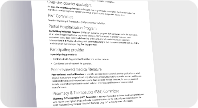 Over-the-counter alternative An over-the-counter alternative is a drug that you may buy without a prescription that has similar safety, efficacy, and ingredients as a prescription drug. Over-the-counter drugs Over-the-counter drugs are medications you may get without a prescription. Over-the-counter equivalent An over-the-counter equivalent is a drug you may buy without a prescription that has identical active ingredients and strengths as a prescription drug or product in a comparable dosage form. P&T Committee See the “Pharmacy & Therapeutics (P&T) Committee” definition. Partial Hospitalization Program Partial Hospitalization Program (PHP) is an outpatient program that is provided under the supervision of an attending psychiatrist or psychiatric extender. PHP is intended to provide treatment on an outpatient basis, does not include boarding or housing, and is intended to provide treatment interventions in a structured setting, with patients returning to their home environments each day. PHP is a minimum of five hours per day, five days per week. Participating provider A participating provider is: • Contracted with Regence BlueShield but is in another network. • Considered out-of-network for your plan. Peer-reviewed medical literature Peer-reviewed medical literature is scientific studies printed in journals or other publications in which original manuscripts are published only after being critically reviewed for scientific accuracy, validity, and reliability by unbiased independent experts. Peer-reviewed medical literature, for example, does not include information from health-related websites or in-house publications of pharmaceutical manufacturers. Pharmacy & Therapeutics (P&T) Committee Pharmacy & Therapeutics (P&T) Committee is a group of providers and other health care professionals who review prescription drugs and make recommendations on the status of prescription drugs on the UMP Preferred Drug List (see “The UMP Preferred Drug List” section for more information). Physician services Physician services are health care services provided or coordinated by a licensed medical physician, such as a: • Doctor of osteopathic medicine (D.O.) • Medical doctor (M.D.) • Naturopathic physician (N.D.) 184 2024 UMP Plus–PSHVN (PEBB) Certificate of Coverage