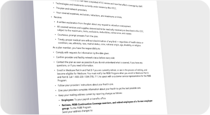 • On request, receive information from the plan about: ▪ How new technology is evaluated for inclusion as a covered service. ▪ How the plan reimburses providers. ▪ Preauthorization review requirements. ▪ Providers you select and their qualifications. ▪ Services and treatments that have completed HTCC review and how that affects coverage by UMP. ▪ Technologies and treatments currently under review by the HTCC. ▪ The plan and network providers. ▪ Your covered expenses, exclusions, reductions, and maximums or limits. • Receive: ▪ A written explanation from the plan about any request to refund an overpayment. ▪ All covered services and supplies determined to be medically necessary as described in this COC, subject to the maximums, limits, exclusions, deductibles, coinsurance, and copays. ▪ Courteous, prompt answers from the plan. ▪ Timely, proper medical care without discrimination of any kind — regardless of health status or condition, sex, ethnicity, race, marital status, color, national origin, age, disability, or religion. As a plan member, you have the responsibility to: • Comply with requests for information by the date given. • Confirm provider and facility network status before every visit. • Contact the plan as soon as possible if you do not understand what is covered, if you have any questions, or if you need information. • Enroll in Medicare Part A and Part B if you are currently retired, or are in the process of retiring, and become eligible for Medicare. You must notify the PEBB Program when you enroll in Medicare Part A and Part B. Call 1-800-200-1004 (TRS: 711) to speak with a customer service representative for the PEBB Program. • Follow your providers’ instructions about your health care. • Give your providers complete information about your health to get the best possible care. • Keep your mailing address current by reporting changes as follows: ▪ Employees: To your payroll or benefits office. ▪ Retirees, PEBB Continuation Coverage members, and retired employees of a former employer group: To the PEBB Program. Send your address changes to: Health Care Authority PEBB Program PO Box 42684 Olympia, WA 98504 • Know how to access emergency care. • Not engage in fraud or abuse in dealing with the plan or your providers. • Participate with your providers in making decisions about your health care. 134 2024 UMP Plus–PSHVN (PEBB) Certificate of Coverage