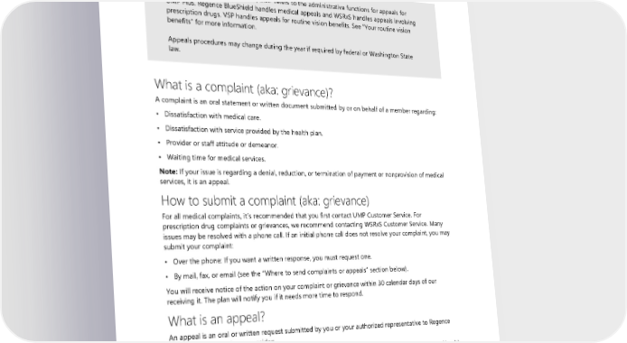 If the plan asks you for more information, you will be allowed at least 45 days to provide it. If the plan does not receive the information requested within the time allowed, the plan will deny the claim. Complaint and appeal procedures ALERT! In the following section, UMP refers to the administrative functions for appeals for UMP Plus. Regence BlueShield handles medical appeals and WSRxS handles appeals involving prescription drugs. VSP handles appeals for routine vision benefits. See “Your routine vision benefits” for more information. Appeals procedures may change during the year if required by federal or Washington State law. What is a complaint (aka: grievance)? A complaint is an oral statement or written document submitted by or on behalf of a member regarding: • Dissatisfaction with medical care. • Dissatisfaction with service provided by the health plan. • Provider or staff attitude or demeanor. • Waiting time for medical services. Note: If your issue is regarding a denial, reduction, or termination of payment or nonprovision of medical services, it is an appeal. How to submit a complaint (aka: grievance) For all medical complaints, it’s recommended that you first contact UMP Customer Service. For prescription drug complaints or grievances, we recommend contacting WSRxS Customer Service. Many issues may be resolved with a phone call. If an initial phone call does not resolve your complaint, you may submit your complaint: • Over the phone: If you want a written response, you must request one. • By mail, fax, or email (see the “Where to send complaints or appeals” section below). You will receive notice of the action on your complaint or grievance within 30 calendar days of our receiving it. The plan will notify you if it needs more time to respond. What is an appeal? An appeal is an oral or written request submitted by you or your authorized representative to Regence BlueShield or WSRxS to reconsider: • A decision to deny, modify, reduce, or terminate payment, coverage, certification, or provision of health care services or benefits, including the admission to, or continued stay in, a health care facility. • A preauthorization. • A retroactive decision to deny coverage based on eligibility (see the “Appeals related to eligibility” section below). 2024 UMP Plus–PSHVN (PEBB) Certificate of Coverage 125