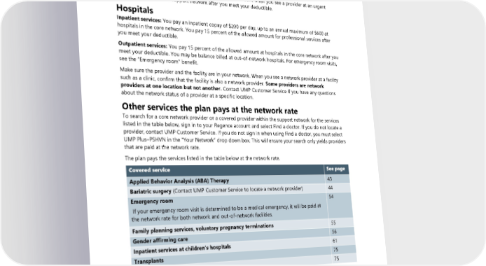 Network facilities Clinics and other outpatient facilities You pay 15 percent of the allowed amount for covered services at clinics and other outpatient facilities in the core network after you meet your deductible. Urgent care clinics: You pay 15 percent of the allowed amount when you see a provider at an urgent care clinic in the core or support network after you meet your deductible. Hospitals Inpatient services: You pay an inpatient copay of $200 per day, up to an annual maximum of $600 at hospitals in the core network. You pay 15 percent of the allowed amount for professional services after you meet your deductible. Outpatient services: You pay 15 percent of the allowed amount at hospitals in the core network after you meet your deductible. You may be balance billed at out-of-network hospitals. For emergency room visits, see the “Emergency room” benefit. Make sure the provider and the facility are in your network. When you see a network provider at a facility such as a clinic, confirm that the facility is also a network provider. Some providers are network providers at one location but not another. Contact UMP Customer Service if you have any questions about the network status of a provider at a specific location. Other services the plan pays at the network rate To search for a core network provider or a covered provider within the support network for the services listed in the table below, sign in to your Regence account and select Find a doctor. If you do not locate a provider, contact UMP Customer Service. If you do not sign in when using Find a doctor, you must select UMP Plus–PSHVN in the “Your Network” drop down box. This will ensure your search only yields providers that are paid at the network rate. The plan pays the services listed in the table below at the network rate. Covered service See page Applied Behavior Analysis (ABA) Therapy 43 Bariatric surgery (Contact UMP Customer Service to locate a network provider) 44 Emergency room 54 If your emergency room visit is determined to be a medical emergency, it will be paid at the network rate for both network and out-of-network facilities. Family planning services, voluntary pregnancy terminations 55 Gender affirming care 56 Inpatient services at children’s hospitals 61 Transplants 75 Urgent care 75 Out-of-network providers If you see a provider with Regence who is not in the core or support network, they are considered out-of- network. If you sign in to your Regence account and use the UMP Plus–PSHVN provider search tool, the results will only show you providers who are in your network unless you update the network filter to include out-of-network providers. Contact UMP Customer Service if you have questions about the network status of a provider. See Directory for link and contact information. 2024 UMP Plus–PSHVN (PEBB) Certificate of Coverage 21