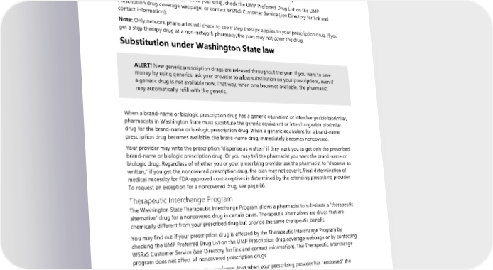 prescription for a Step 2 drug, the plan will not cover your prescription. When this happens, your provider will need to prescribe the Step 1 drug for you. If you or your provider feels that you need the Step 2 prescription filled as originally written without first trying the Step 1 drug, your pharmacist or prescribing provider may contact WSRxS Customer Service and request coverage. You will have to pay the entire cost of the prescription drug if you have not tried the Step 1 drug and coverage has not been authorized before you get the Step 2 drug. To find out if step therapy applies to your drug, check the UMP Preferred Drug List on the UMP Prescription drug coverage webpage, or contact WSRxS Customer Service (see Directory for link and contact information). Note: Only network pharmacies will check to see if step therapy applies to your prescription drug. If you get a step therapy drug at a non-network pharmacy, the plan may not cover the drug. Substitution under Washington State law ALERT! New generic prescription drugs are released throughout the year. If you want to save money by using generics, ask your provider to allow substitution on your prescriptions, even if a generic drug is not available now. That way, when one becomes available, the pharmacist may automatically refill with the generic. When a brand-name or biologic prescription drug has a generic equivalent or interchangeable biosimilar, pharmacists in Washington State must substitute the generic equivalent or interchangeable biosimilar drug for the brand-name or biologic prescription drug. When a generic equivalent for a brand-name prescription drug becomes available, the brand-name drug immediately becomes noncovered. Your provider may write the prescription “dispense as written” if they want you to get only the prescribed brand-name or biologic prescription drug. Or you may tell the pharmacist you want the brand-name or biologic drug. Regardless of whether you or your prescribing provider ask the pharmacist to “dispense as written,” if you get the noncovered prescription drug, the plan may not cover it. Final determination of medical necessity for FDA-approved contraceptives is determined by the attending prescribing provider. To request an exception for a noncovered drug, see page 86. Therapeutic Interchange Program The Washington State Therapeutic Interchange Program allows a pharmacist to substitute a “therapeutic alternative” drug for a noncovered drug in certain cases. Therapeutic alternatives are drugs that are chemically different from your prescribed drug but provide the same therapeutic benefit. You may find out if your prescription drug is affected by the Therapeutic Interchange Program by checking the UMP Preferred Drug List on the UMP Prescription drug coverage webpage or by contacting WSRxS Customer Service (see Directory for link and contact information). The Therapeutic Interchange program does not affect all noncovered prescription drugs. The pharmacist will substitute the preferred drug when your prescribing provider has “endorsed” the Washington Preferred Drug List, and: • You are filling your prescription in Washington State or through UMP’s network mail-order pharmacies. • Your prescribing provider allows substitution on your prescription. If you do not want your prescription drug to be changed, the plan may not cover your drug if you ask the pharmacist to fill the prescription as written. 2024 UMP Plus–UW Medicine ACN (PEBB) Certificate of Coverage 101