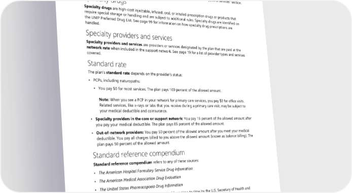 program and is enrolled in the 2025 plan year. More details on eligibility and program requirements are on HCA's SmartHealth webpage at hca.wa.gov/pebb-smarthealth. Special rate The plan’s special rate is for services that have unique payment rules. These rules are described in the table (see the “How much you pay for covered services” column) located in the “Types of services” section. Specialty drugs Specialty drugs are high-cost injectable, infused, oral, or inhaled prescription drugs or products that require special storage or handling and are subject to additional rules. Specialty drugs are identified on the UMP Preferred Drug List. See page 99 for information on how specialty drug prescriptions are handled. Specialty providers and services Specialty providers and services are providers or services designated by the plan that are paid at the network rate when included in the support network. See page 19 for a list of provider types and services covered. Standard rate The plan’s standard rate depends on the provider’s status: • PCPs, including naturopaths: ▪ You pay $0 for most services. The plan pays 100 percent of the allowed amount. Note: When you see a PCP in your network for primary care services, you pay $0 for office visits. Related services, like x-rays or labs that you receive during a primary care visit, may be subject to your medical deductible and coinsurance. • Specialty providers in the core or support network: You pay 15 percent of the allowed amount after you pay your medical deductible. The plan pays 85 percent of the allowed amount. • Out-of-network providers: You pay 50 percent of the allowed amount after you meet your medical deductible. You pay all charges billed to you above the allowed amount (known as balance billing). The plan pays 50 percent of the allowed amount. Standard reference compendium Standard reference compendium refers to any of these sources: • The American Hospital Formulary Service Drug Information • The American Medical Association Drug Evaluation • The United States Pharmacopoeia Drug Information • Other authoritative compendia as identified from time to time by the U.S. Secretary of Health and Human Services State Agency State agency means an office, department, board, commission, institution, or other separate unit or division, however designated, of the Washington state government. It includes the legislature, executive 190 2024 UMP Plus–UW Medicine ACN (PEBB) Certificate of Coverage