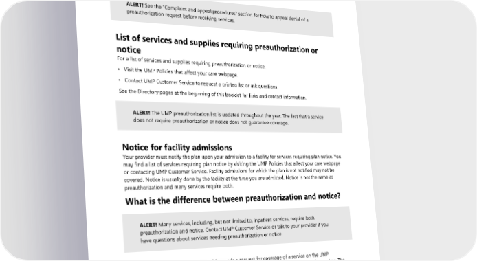 You are encouraged to request that an out-of-network provider preauthorize certain services on your behalf to determine medical necessity before the services are provided. They have the clinical details and technical billing information needed to submit a request. You may be liable for all charges if you receive services that are determined to be not medically necessary, experimental or investigational, or not covered under this plan (see the “What the plan does not cover” section). ALERT! See the “Complaint and appeal procedures” section for how to appeal denial of a preauthorization request before receiving services. List of services and supplies requiring preauthorization or notice For a list of services and supplies requiring preauthorization or notice: • Visit the UMP Policies that affect your care webpage. • Contact UMP Customer Service to request a printed list or ask questions. See the Directory pages at the beginning of this booklet for links and contact information. ALERT! The UMP preauthorization list is updated throughout the year. The fact that a service does not require preauthorization or notice does not guarantee coverage. Notice for facility admissions Your provider must notify the plan upon your admission to a facility for services requiring plan notice. You may find a list of services requiring plan notice by visiting the UMP Policies that affect your care webpage or contacting UMP Customer Service. Facility admissions for which the plan is not notified may not be covered. Notice is usually done by the facility at the time you are admitted. Notice is not the same as preauthorization and many services require both. What is the difference between preauthorization and notice? ALERT! Many services, including, but not limited to, inpatient services, require both preauthorization and notice. Contact UMP Customer Service or talk to your provider if you have questions about services needing preauthorization or notice. “Preauthorization” is when your provider sends a request for coverage of a service on the UMP preauthorization list. Preauthorization is usually requested by the provider performing the services. The plan sends either an approval or denial of coverage. If the plan does not approve services that require preauthorization before services are received, the plan may deny coverage. The plan does not approve or deny preauthorization for services that are not on the UMP preauthorization list. 2024 UMP Plus–UW Medicine ACN (PEBB) Certificate of Coverage 105
