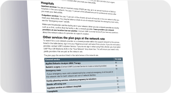 Network facilities Clinics and other outpatient facilities You pay 15 percent of the allowed amount for covered services at clinics and other outpatient facilities in the core network after you meet your deductible. Urgent care clinics: You pay 15 percent of the allowed amount when you see a provider at an urgent care clinic in the core or support network after you meet your deductible. Hospitals Inpatient services: You pay an inpatient copay of $200 per day, up to an annual maximum of $600 at hospitals in the core network. You pay 15 percent of the allowed amount for professional services after you meet your deductible. Outpatient services: You pay 15 percent of the allowed amount at hospitals in the core network after you meet your deductible. You may be balance billed at out-of-network hospitals. For emergency room visits, see the “Emergency room” benefit. Make sure the provider and the facility are in your network. When you see a network provider at a facility such as a clinic, confirm that the facility is also a network provider. Some providers are network providers at one location but not another. Contact UMP Customer Service if you have any questions about the network status of a provider at a specific location. Other services the plan pays at the network rate To search for a core network provider or a covered provider within the support network for the services listed in the table below, sign in to your Regence account and select Find a doctor. If you do not locate a provider, contact UMP Customer Service. If you do not sign in when using Find a doctor, you must select UMP Plus–UW Medicine ACN in the “Your Network” drop down box. This will ensure your search only yields providers that are paid at the network rate. The plan pays the services listed in the table below at the network rate. Covered service See page Applied Behavior Analysis (ABA) Therapy 43 Bariatric surgery (Contact UMP Customer Service to locate a network provider) 44 Emergency room 54 If your emergency room visit is determined to be a medical emergency, it will be paid at the network rate for both network and out-of-network facilities. Family planning services, voluntary pregnancy terminations 55 Gender affirming care 56 Inpatient services at children’s hospitals 61 Transplants 75 Urgent care 75 Out-of-network providers If you see a provider with Regence who is not in the core or support network, they are considered out-of- network. If you sign in to your Regence account and use the UMP Plus–UW Medicine ACN provider search tool, the results will only show you providers who are in your network unless you update the network filter to include out-of-network providers. Contact UMP Customer Service if you have questions about the network status of a provider. See Directory for link and contact information. 2024 UMP Plus–UW Medicine ACN (PEBB) Certificate of Coverage 21