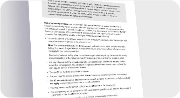 • When you receive nonemergency services at a network hospital, network hospital outpatient department, network critical access hospital, or network ambulatory surgical center in Washington State, you pay the network rate and cannot be balance billed regardless of the network status of the provider. For nonemergency services performed at one of these facilities outside of Washington State, you still pay the network rate, but in some states, an out-of-network provider may be allowed to ask you to waive some of your balance billing protections. ALERT! Not all providers contracted with Regence are included in the core or support network. If you see a contracted provider with Regence who is not in the UMP Plus core or support network, those providers are considered out-of-network. Regence contracted providers cannot balance bill you. The UMP provider search includes the network status of all providers, including out-of-network providers. Be sure to confirm that your provider is in the core or support network to have the highest level of coverage. Out-of-network providers—are any providers who are not in the core or support network. Out-of- network providers may include providers who have a contract with Regence, but are not included in the core or support network. If you see one of these providers, they are considered out-of-network. The UMP Plus–Plus–UW Medicine ACN provider search directory includes core, support, and out-of-network providers. The status of the provider is displayed in the provider search directory. • You pay 50 percent of the allowed amount after you meet your medical deductible. The plan pays most covered services at 50 percent of the allowed amount. Note: The provider may bill you for charges above the allowed amount, which is known as balance billing. You pay all charges billed to you above the allowed amount. Any balance billed amounts do not apply to your out-of-pocket limit. At an out-of-network facility, when you receive emergency services you pay the network cost-sharing amount regardless of the network status of the provider or facility, and cannot be balance billed. • You pay 50 percent of the allowed amount for covered preventive care services, including covered preventive immunizations. You will pay all charges above the allowed amount (balance billing). The plan pays 50 percent of the allowed amount. • You pay $0 for flu shots and COVID-19 vaccines. • The plan pays 100 percent of the allowed amount for covered preventive childhood immunizations. • The 50 percent coinsurance you pay to out-of-network providers, and any balance billed amounts, do not apply to your medical deductible or out-of-pocket limit. • You may have to pay for services upfront and send the claim to the plan yourself. • The provider may not be familiar with UMP prescription drug guidelines and prescribe drugs subject to higher cost, or that the plan does not cover. Note: The plan may send payment for out-of-network services to you or the provider. ALERT! Some services and supplies are not covered by the plan or have benefit limits. If you receive services that are not covered by the plan or you exceed your benefit limit, you will pay for those services or supplies, even if you see a network provider. Contact UMP Customer Service to find out if a service or supply is covered. 2024 UMP Plus–UW Medicine ACN (PEBB) Certificate of Coverage 17