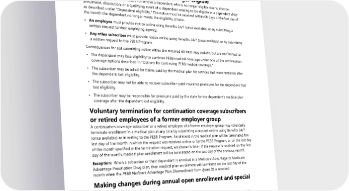 If the special open enrollment is due to the enrollment of an extended dependent or a dependent child with a disability, medical coverage will begin the first day of the month following the event date or eligibility certification, whichever is later. Making changes Removing a dependent who is no longer eligible A subscriber must provide notice to remove a dependent who is no longer eligible due to divorce, annulment, dissolution, or a qualifying event of a dependent ceasing to be eligible as a dependent child as described under “Dependent eligibility.” The notice must be received within 60 days of the last day of the month the dependent no longer meets the eligibility criteria. • An employee must provide notice online using Benefits 24/7 (once available) or by submitting a written request to their employing agency. • Any other subscriber must provide notice online using Benefits 24/7 (once available) or by submitting a written request to the PEBB Program. Consequences for not submitting notice within the required 60 days may include, but are not limited to: • The dependent may lose eligibility to continue PEBB medical coverage under one of the continuation coverage options described in “Options for continuing PEBB medical coverage.” • The subscriber may be billed for claims paid by the medical plan for services that were rendered after the dependent lost eligibility. • The subscriber may not be able to recover subscriber-paid insurance premiums for the dependent that lost eligibility. • The subscriber may be responsible for premiums paid by the state for the dependent’s medical plan coverage after the dependent lost eligibility. Voluntary termination for continuation coverage subscribers or retired employees of a former employer group A continuation coverage subscriber or a retired employee of a former employer group may voluntarily terminate enrollment in a medical plan at any time by submitting a request online using Benefits 24/7 (once available) or in writing to the PEBB Program. Enrollment in the medical plan will be terminated the last day of the month in which the request was received online or by the PEBB Program, or on the last day of the month specified in the termination request, whichever is later. If the request is received on the first day of the month, medical plan enrollment will be terminated on the last day of the previous month. Exception: When a subscriber or their dependent is enrolled in a Medicare Advantage or Medicare Advantage Prescription Drug plan, then medical plan enrollment will terminate on the last day of the month when the PEBB Medicare Advantage Plan Disenrollment form (form D) is received. Making changes during annual open enrollment and special open enrollment A subscriber may make certain changes to their enrollment during the annual open enrollment and if a specific life event creates a special open enrollment period. Annual open enrollment changes An employee may make the following changes to their enrollment during the PEBB Program’s annual open enrollment period: • Change their medical plan 146 2024 UMP Plus–UW Medicine ACN (PEBB) Certificate of Coverage