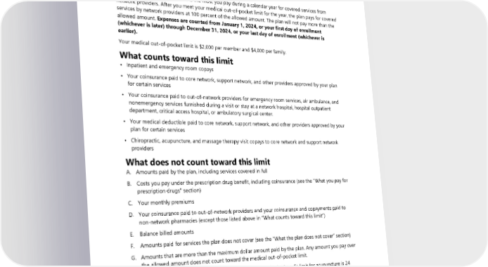 Medical out-of-pocket limit ALERT! Prescription drug costs do not apply to your medical out-of-pocket limit (see below). The medical out-of-pocket limit is the most you pay during a calendar year for covered services from network providers. After you meet your medical out-of-pocket limit for the year, the plan pays for covered services by network providers at 100 percent of the allowed amount. The plan will not pay more than the allowed amount. Expenses are counted from January 1, 2024, or your first day of enrollment (whichever is later) through December 31, 2024, or your last day of enrollment (whichever is earlier). Your medical out-of-pocket limit is $2,000 per member and $4,000 per family. What counts toward this limit • Inpatient and emergency room copays • Your coinsurance paid to core network, support network, and other providers approved by your plan for certain services • Your coinsurance paid to out-of-network providers for emergency room services, air ambulance, and nonemergency services furnished during a visit or stay at a network hospital, hospital outpatient department, critical access hospital, or ambulatory surgical center. • Your medical deductible paid to core network, support network, and other providers approved by your plan for certain services • Chiropractic, acupuncture, and massage therapy visit copays to core network and support network providers What does not count toward this limit A. Amounts paid by the plan, including services covered in full B. Costs you pay under the prescription drug benefit, including coinsurance (see the "What you pay for prescription drugs" section) C. Your monthly premiums D. Your coinsurance paid to out-of-network providers and your coinsurance and copayments paid to non-network pharmacies (except those listed above in “What counts toward this limit”) E. Balance billed amounts F. Amounts paid for services the plan does not cover (see the “What the plan does not cover” section) G. Amounts that are more than the maximum dollar amount paid by the plan. Any amount you pay over the allowed amount does not count toward the medical out-of-pocket limit. H. Amounts paid for services over a benefit limit. For example, the benefit limit for acupuncture is 24 visits. If you have more than 24 acupuncture visits in one year, you will pay in full for those visits, and what you pay will not count toward this limit. What you pay after reaching this limit After you meet your out-of-pocket limit for the year, you pay: 32 2024 UMP Plus–UW Medicine ACN (PEBB) Certificate of Coverage