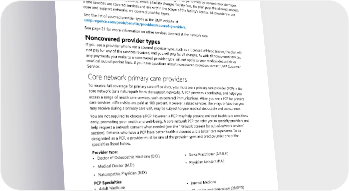 ensure your search results only return network providers. Contact UMP Customer Service if you have questions about the network status of a provider. Covered and noncovered provider types Covered provider types The plan pays the allowed amount for covered services only when performed by covered provider types within the scope of their license(s). When a facility charges facility fees, the plan pays the allowed amount if the services are covered services and are within the scope of the facility’s license. All providers in the core and support networks are covered provider types. See the list of covered provider types at the UMP website at ump.regence.com/pebb/benefits/providers/covered-providers. See page 21 for more information on other services covered at the network rate. Noncovered provider types If you see a provider who is not a covered provider type, such as a Licensed Athletic Trainer, the plan will not pay for any of the services received, and you will pay for all charges. As with all noncovered services, any payments you make to a noncovered provider type will not apply to your medical deductible or medical out-of-pocket limit. If you have questions about noncovered providers contact UMP Customer Service. Core network primary care providers To receive full coverage for primary care office visits, you must see a primary care provider (PCP) in the core network (or a naturopath from the support network). A PCP provides, coordinates, and helps you access a range of health care services, such as covered immunizations. When you see a PCP for primary care services, office visits are paid at 100 percent. However, related services, like x-rays or labs that you may receive during a primary care visit, may be subject to your medical deductible and coinsurance. You are not required to choose a PCP. However, a PCP may help prevent and treat health care conditions early, promoting your health and well-being. A core network PCP can refer you to specialty providers and help request a network consent when needed (see the “Network consent for out-of-network services” section). Patients who have a PCP have better health outcomes and a better care experience. To be designated as a PCP, a provider must be one of the provider types and practice under one of the specialties listed below. Provider type: • Doctor of Osteopathic Medicine (D.O.) • Nurse Practitioner (A.R.N.P.) • Medical Doctor (M.D.) • Physician Assistant (P.A.) • Naturopathic Physician (N.D.) PCP Specialties: • Adult Medicine • Internal Medicine • Family Practice • Obstetrics and gynecology (OB/GYN) • General Practice • Pediatrics (for members under age 18) • Geriatrics • Preventive Medicine When you see a PCP for primary care services, office visits are paid at 100 percent. However, related services, like x-rays or labs that you may receive during a primary care visit, may be subject to your medical deductible and coinsurance. 2024 UMP Plus–UW Medicine ACN (PEBB) Certificate of Coverage 19