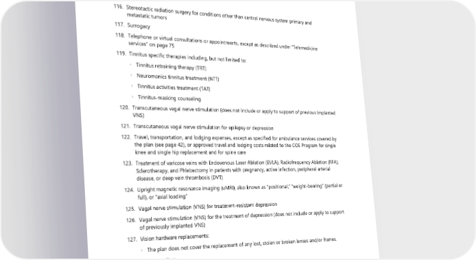 ◦ Adrenal ◦ Melanoma ◦ Merkel cell ◦ Breast ◦ Ovarian ◦ Cervical 116. Stereotactic radiation surgery for conditions other than central nervous system primary and metastatic tumors 117. Surrogacy 118. Telephone or virtual consultations or appointments, except as described under “Telemedicine services” on page 75 119. Tinnitus specific therapies including, but not limited to: ◦ Tinnitus retraining therapy (TRT) ◦ Neuromonics tinnitus treatment (NTT) ◦ Tinnitus activities treatment (TAT) ◦ Tinnitus-masking counseling 120. Transcutaneous vagal nerve stimulation (does not include or apply to support of previous implanted VNS) 121. Transcutaneous vagal nerve stimulation for epilepsy or depression 122. Travel, transportation, and lodging expenses, except as specified for ambulance services covered by the plan (see page 42), or approved travel and lodging costs related to the COE Program for single knee and single hip replacement and for spine care 123. Treatment of varicose veins with Endovenous Laser Ablation (EVLA), Radiofrequency Ablation (RFA), Sclerotherapy, and Phlebectomy in patients with pregnancy, active infection, peripheral arterial disease, or deep vein thrombosis (DVT) 124. Upright magnetic resonance imaging (uMRI), also known as “positional,” “weight-bearing” (partial or full), or “axial loading” 125. Vagal nerve stimulation (VNS) for treatment-resistant depression 126. Vagal nerve stimulation (VNS) for the treatment of depression (does not include or apply to support of previously implanted VNS) 127. Vision hardware replacements: ◦ The plan does not cover the replacement of any lost, stolen or broken lenses and/or frames. 128. Vision, routine: ◦ Certain contact lens expenses: • Artistically-painted or nonprescription contact lenses; • Contact lens modification, polishing or cleaning; • Refitting of contact lenses after the initial (90-day) fitting period; • Additional office visits associated with contact lens pathology; and • Contact lens insurance policies or service agreements. ◦ Corrective vision treatment of an experimental or investigational nature 2024 UMP Plus–UW Medicine ACN (PEBB) Certificate of Coverage 115