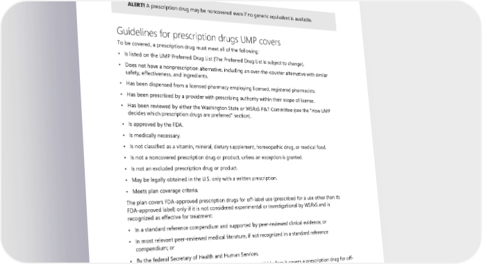 Not all prescription drug classes are reviewed by the Washington State P&T Committee. For these prescription drugs, the WSRxS P&T Committee makes coverage recommendations for HCA’s review and final determination of a drug’s tier level. For the plan to cover a prescription drug for you, it must be medically necessary for your health condition. Your provider may prescribe a drug or drug dosage that does not meet the plan’s definition of medically necessary and therefore will not be covered. ALERT! A prescription drug may be noncovered even if no generic equivalent is available. Guidelines for prescription drugs UMP covers To be covered, a prescription drug must meet all of the following: • Is listed on the UMP Preferred Drug List (The Preferred Drug List is subject to change). • Does not have a nonprescription alternative, including an over-the-counter alternative with similar safety, effectiveness, and ingredients. • Has been dispensed from a licensed pharmacy employing licensed, registered pharmacists. • Has been prescribed by a provider with prescribing authority within their scope of license. • Has been reviewed by either the Washington State or WSRxS P&T Committee (see the "How UMP decides which prescription drugs are preferred" section). • Is approved by the FDA. • Is medically necessary. • Is not classified as a vitamin, mineral, dietary supplement, homeopathic drug, or medical food. • Is not a noncovered prescription drug or product, unless an exception is granted. • Is not an excluded prescription drug or product. • May be legally obtained in the U.S. only with a written prescription. • Meets plan coverage criteria. The plan covers FDA-approved prescription drugs for off-label use (prescribed for a use other than its FDA-approved label) only if it is not considered experimental or investigational by WSRxS and is recognized as effective for treatment: • In a standard reference compendium and supported by peer-reviewed clinical evidence; or • In most relevant peer-reviewed medical literature, if not recognized in a standard reference compendium; or • By the federal Secretary of Health and Human Services. Note: The plan may require that you try standard treatment(s) before it covers a prescription drug for off- label use (prescribed for a use other than its FDA-approved label). The plan will not cover any prescription drug when the FDA has determined its use to be unsafe. ALERT! The plan does not cover prescription drugs purchased through mail-order pharmacies located outside the U.S. 88 2024 UMP Plus–UW Medicine ACN (PEBB) Certificate of Coverage