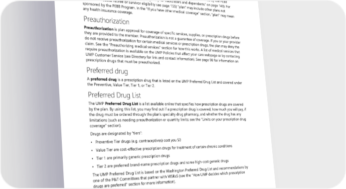 Find the complete list of covered provider types on the UMP website at ump.regence.com/pebb/benefits/providers/covered-providers. Plan Plan, as referred to in this document, means UW ACN: Uniform Medical Plan Plus–UW Medicine Accountable Care Network (UMP Plus–UW Medicine ACN), a self-insured ACP offered by the PEBB Program. In the eligibility sections (see “Eligibility for subscribers and dependents” on page 140). For information about retiree or survivor eligibility see page 155) “plan” may include other plans not sponsored by the PEBB Program. In the “If you have other medical coverage” section, “plan” may mean any health insurance coverage. Preauthorization Preauthorization is plan approval for coverage of specific services, supplies, or prescription drugs before they are provided to the member. Preauthorization is not a guarantee of coverage. If you or your provider do not receive preauthorization for certain medical services or prescription drugs, the plan may deny the claim. See the “Preauthorizing medical services” section for how this works. A list of medical services that require preauthorization is available on the UMP Policies that affect your care webpage or by contacting UMP Customer Service (see Directory for link and contact information). See page 98 for information on prescription drugs that must be preauthorized. Preferred drug A preferred drug is a prescription drug that is listed on the UMP Preferred Drug List and covered under the Preventive, Value Tier, Tier 1, or Tier 2. Preferred Drug List The UMP Preferred Drug List is a list available online that specifies how prescription drugs are covered by the plan. By using this list, you may find out if a prescription drug is covered, how much you will pay, if the drug must be ordered through the plan’s specialty drug pharmacy, and whether the drug has any limitations (such as needing preauthorization or quantity limits; see the ”Limits on your prescription drug coverage” section). Drugs are designated by “tiers”: • Preventive Tier drugs (e.g. contraceptives) cost you $0 • Value Tier are cost-effective prescription drugs for treatment of certain chronic conditions • Tier 1 are primarily generic prescription drugs • Tier 2 are preferred brand-name prescription drugs and some high-cost generic drugs The UMP Preferred Drug List is based on the Washington Preferred Drug List and recommendations by one of the P&T Committees that partner with WSRxS (see the “How UMP decides which prescription drugs are preferred” section for more information). Prenatal Prenatal means during pregnancy. Prescription cost-limit The prescription cost-limit is the most you pay for a Value Tier drug, Tier 1 drug, and Tier 2 drug at a network pharmacy. See the “How the prescription drug cost-limit works” section for more information. 2024 UMP Plus–UW Medicine ACN (PEBB) Certificate of Coverage 185
