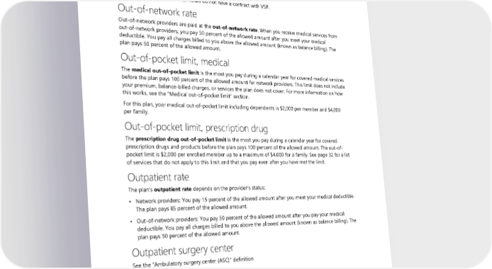 • Outside the Regence BlueShield service area, but is not contracted with another Blue Cross or Blue Shield organization in the BlueCard® Program (designated as a provider in the PPO network) to provide services and supplies to plan members. See page 17 for a description of how services by these providers are covered. Out-of-network provider(s), vision Out-of-network provider(s), vision do not have a contract with VSP. Out-of-network rate Out-of-network providers are paid at the out-of-network rate. When you receive medical services from out-of-network providers, you pay 50 percent of the allowed amount after you meet your medical deductible. You pay all charges billed to you above the allowed amount (known as balance billing). The plan pays 50 percent of the allowed amount. Out-of-pocket limit, medical The medical out-of-pocket limit is the most you pay during a calendar year for covered medical services before the plan pays 100 percent of the allowed amount for network providers. This limit does not include your premium, balance-billed charges, or services the plan does not cover. For more information on how this works, see the “Medical out-of-pocket limit” section. For this plan, your medical out-of-pocket limit including dependents is $2,000 per member and $4,000 per family. Out-of-pocket limit, prescription drug The prescription drug out-of-pocket limit is the most you pay during a calendar year for covered prescription drugs and products before the plan pays 100 percent of the allowed amount. The out-of- pocket limit is $2,000 per enrolled member up to a maximum of $4,000 for a family. See page 32 for a list of services that do not apply to this limit and that you pay even after you have met the limit. Outpatient rate The plan’s outpatient rate depends on the provider’s status: • Network providers: You pay 15 percent of the allowed amount after you meet your medical deductible. The plan pays 85 percent of the allowed amount. • Out-of-network providers: You pay 50 percent of the allowed amount after you pay your medical deductible. You pay all charges billed to you above the allowed amount (known as balance billing). The plan pays 50 percent of the allowed amount. Outpatient surgery center See the “Ambulatory surgery center (ASC)” definition. Outward Bound An international network of outdoor education organizations whose aim is to foster the personal growth and social skills of participants by using challenging expeditions in the outdoors. 2024 UMP Plus–UW Medicine ACN (PEBB) Certificate of Coverage 183