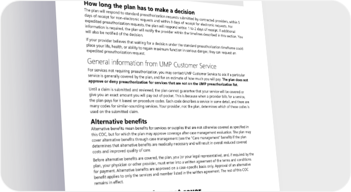 “Notice” means that your provider must contact the plan to let us know when you receive services. Notice is usually done by the facility when you are admitted. ALERT! If the plan denies preauthorization and you receive those services anyway, you are responsible for the provider’s entire billed charge. How long the plan has to make a decision The plan will respond to standard preauthorization requests submitted by contracted providers, within 5 days of receipt for non-electronic requests and within 3 days of receipt for electronic requests. For expedited preauthorization requests, the plan will respond within 1 to 2 days of receipt. If additional information is required, the plan will notify the provider within the timelines described in this section. You will also be notified of the decision. If your provider believes that waiting for a decision under the standard preauthorization timeframe could place your life, health, or ability to regain maximum function in serious danger, they can request an expedited preauthorization request. General information from UMP Customer Service For services not requiring preauthorization, you may contact UMP Customer Service to ask if a particular service is generally covered by the plan, and for an estimate of how much you will pay. The plan does not approve or deny preauthorization for services that are not on the UMP preauthorization list. Until a claim is submitted and reviewed, the plan cannot guarantee that your service will be covered or give you an exact amount you will pay out of pocket. This is because when a provider bills for a service, the plan pays for it based on procedure codes. Each code describes a service in some detail, and there are many codes for similar-sounding services. Your provider, not the plan, determines which of these codes is used on the submitted claim. Alternative benefits Alternative benefits mean benefits for services or supplies that are not otherwise covered as specified in this COC, but for which the plan may approve coverage after case management evaluation. The plan may cover alternative benefits through case management (see the “Care management” benefit) if the plan determines that alternative benefits are medically necessary and will result in overall reduced covered costs and improved quality of care. Before alternative benefits are covered, the plan, you (or your legal representative), and, if required by the plan, your physician or other provider, must enter into a written agreement of the terms and conditions for payment. Alternative benefits are approved on a case-specific basis only. Approval of an alternative benefit applies to only the services and member listed in the written agreement. The rest of this COC remains in effect. What the plan does not cover TIP: If you have any questions about services the plan does not cover, contact UMP Customer Service or WSRxS Customer Service. 106 2024 UMP Plus–UW Medicine ACN (PEBB) Certificate of Coverage