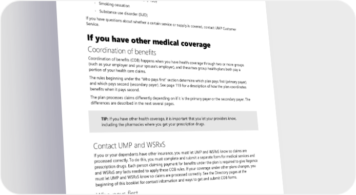 133. Workers’ compensation: When a claim for workers’ compensation is accepted, all services related to that injury or illness are not covered, even if some services are denied by workers’ compensation 134. Transcranial Magnetic Stimulation (TMS) for treatment of: ◦ Obsessive-compulsive disorder (OCD) ◦ Generalized anxiety disorder (GAD) ◦ Posttraumatic stress disorder (PTSD) ◦ Smoking cessation ◦ Substance use disorder (SUD) If you have questions about whether a certain service or supply is covered, contact UMP Customer Service. If you have other medical coverage Coordination of benefits Coordination of benefits (COB) happens when you have health coverage through two or more groups (such as your employer and your spouse’s employer), and these two group health plans both pay a portion of your health care claims. The rules beginning under the “Who pays first” section determine which plan pays first (primary payer) and which pays second (secondary payer). See page 119 for a description of how the plan coordinates benefits when it pays second. The plan processes claims differently depending on if it is the primary payer or the secondary payer. The differences are described in the next several pages. TIP: If you have other health coverage, it is important that you let your providers know, including the pharmacies where you get your prescription drugs. Contact UMP and WSRxS If you or your dependents have other insurance, you must let UMP and WSRxS know so claims are processed correctly. To do this, you must complete and submit a separate form for medical services and prescription drugs. Each person claiming payment for benefits under the plan is required to give Regence and WSRxS any facts needed to apply these COB rules. If your coverage under other plans changes, you must let UMP and WSRxS know so claims are processed correctly. See the Directory pages at the beginning of this booklet for contact information and ways to get and submit COB forms. Who pays first Note: If you cannot determine which plan pays first, contact UMP Customer Service. 2024 UMP Plus–UW Medicine ACN (PEBB) Certificate of Coverage 117