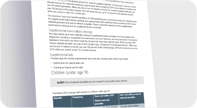 • $150 necessary contact lenses including any fitting/evaluation services Low vision benefit The plan covers low vision benefits when vision loss is sufficient enough to prevent reading and performing daily activities with standard corrective eyewear. If you fall within this category, you are entitled to professional services, as well as ophthalmic materials. These services and equipment are subject to the limitations stated below. Contact your VSP Choice network provider for more information. You pay 25 percent of the allowed amount for covered supplemental aids. The plan pays 75 percent of the allowed amount for medically necessary supplemental aids provided by VSP choice network providers and out-of-network providers. When you see an out-of-network provider for covered supplemental aids, you pay 100 percent of the billed charges. VSP will reimburse you up to 75 percent of the allowed amount when you submit a claim for covered aids. The maximum low vision benefit available is $1,000 (excluding your coinsurance) every two calendar years for supplemental examinations (testing) and supplemental aids combined when provided by VSP Choice network providers and out-of-network providers. There is a benefit maximum of two supplemental examinations (testing) and all supplemental aids combined. Supplemental examinations (testing) You may receive up to two medically necessary supplemental tests (complete low vision analysis and diagnosis), including a comprehensive examination of visual functions, and the prescription of corrective eyewear or low vision aids when noted by the provider every two calendar years. When you see a VSP Choice network provider, you pay $0 and the plan pays 100 percent of the allowed amount. When you see an out-of-network provider you pay 100 percent of the billed charges. VSP will reimburse you up to $125 when you submit a claim for covered services. Supplemental aids The plan pays for covered supplemental aids every two calendar years, which may include: • Optical and non-optical aids; and • Training on how to use the aids. Children (under age 19) ALERT! Out-of-network providers are not covered for any routine vision services. The below VSP coverage table applies to children under age 19. Benefit Frequency Your cost with a VSP Your cost with an out-of- Choice network network provider provider Professional One per calendar You pay $0 of the allowed You pay 100% of billed comprehensive year. amount and the plan pays charges. routine eye 100% of the allowed exams amount. 2024 UMP Plus–UW Medicine ACN (PEBB) Certificate of Coverage 81