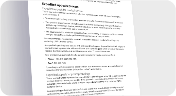 contacting UMP Customer Service (medical appeals) or WSRxS Customer Service (prescription drug appeals). Regence BlueShield manages second-level appeals for medical services, and WSRxS manages second- level appeals for prescription drugs. Employees from Regence BlueShield and WSRxS reviewing the appeals will not have been involved in, or subordinate to anyone involved in, reviewing the first-level appeal or initial decision. If new or additional evidence or rationale is considered in reviewing your appeal, the plan will provide you with this information free of charge, and you may respond before the final decision. Expedited appeals process Expedited appeals for medical services You or your authorized representative may submit an expedited appeal within 180 days of receiving the previous decision if: • You are currently receiving or prescribed treatment or benefits that would end because of the denial; or • Your provider determines that taking the usual time allowed could seriously affect your life, health, or ability to regain maximum function, or would subject you to severe pain that cannot be adequately managed without the disputed care or treatment; or • The issue is related to admission, availability of care, continued stay, or emergency health care services and you have not been discharged from the emergency room or transport service. You may authorize a representative to submit an expedited appeal on your behalf in writing or by contacting UMP Customer Service. An expedited appeal replaces both the first- and second-level appeals. Regence BlueShield will call you, or your authorized representative, with a decision on your expedited appeal within 72 hours of the request. Regence BlueShield will also mail a written response within 72 hours of the decision. Your provider must submit all clinically relevant information to the plan by phone or fax at: • Phone: 1-888-849-3681 (TRS: 711) • Fax: 1-877-663-7526 If you disagree with the expedited appeal decision, your provider may request an expedited external review (see the “External review (independent review)” section below). Expedited appeals for prescription drugs You or your authorized representative may submit an expedited appeal within 180 days of receiving the previous decision if you or your provider thinks you need a prescription drug immediately. You may authorize a representative to submit an appeal on your behalf in writing or by contacting WSRxS Customer Service. An expedited appeal replaces both the first- and second-level appeals. WSRxS will call you, or your authorized representative, with a decision on your expedited appeal within 72 hours of the request. WSRxS will also mail a written response within 72 hours of the decision. You or your provider must submit all clinically relevant information to the plan by phone or fax at: • Phone: 1-888-361-1611 (TRS: 711) • Fax: 1-866-923-0412 During an expedited appeal, you may choose to purchase a three-day supply at your own expense. If WSRxS decides to cover the prescription drug, WSRxS will reimburse you up to the allowed amount minus 128 2024 UMP Plus–UW Medicine ACN (PEBB) Certificate of Coverage