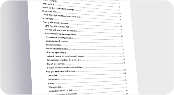 Table of Contents Directory .................................................................................................................................................................................................. 1 Directory: medical services ......................................................................................................................................................... 1 Directory: vision services ............................................................................................................................................................. 4 Directory: prescription drug services ..................................................................................................................................... 6 Table of Contents ................................................................................................................................................................................ 8 Online services ................................................................................................................................................................................... 13 How to use this certificate of coverage ................................................................................................................................. 14 About UMP Plus ................................................................................................................................................................................ 14 UMP Plus: High-quality care at a lower cost ................................................................................................................... 15 Accumulators ..................................................................................................................................................................................... 15 Finding a health care provider ................................................................................................................................................... 15 UMP Plus–UW Medicine ACN ................................................................................................................................................ 16 Covered and noncovered provider types ......................................................................................................................... 19 Core network primary care providers ................................................................................................................................. 19 Core network specialty providers ......................................................................................................................................... 20 Support network providers ..................................................................................................................................................... 20 Network facilities ......................................................................................................................................................................... 21 Out-of-network providers ....................................................................................................................................................... 21 How much you will pay ............................................................................................................................................................. 22 Network consent for out-of-network services ............................................................................................................... 23 Services received outside the service area ....................................................................................................................... 24 Out-of-area services ................................................................................................................................................................... 25 Services received outside the United States ................................................................................................................... 27 What you pay for medical services .......................................................................................................................................... 28 Deductible ....................................................................................................................................................................................... 28 Coinsurance .................................................................................................................................................................................... 30 Copay ................................................................................................................................................................................................ 31 When you pay ............................................................................................................................................................................... 31 Medical out-of-pocket limit .................................................................................................................................................... 32 Summary of services and payments ........................................................................................................................................ 33 Deductible and limits ................................................................................................................................................................. 34 Types of services .......................................................................................................................................................................... 34 What else you need to know .............................................................................................................