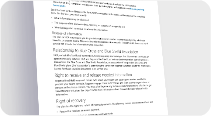 • Talk to the plan about claims or services. To authorize release of protected health information, you must complete an Authorization to Disclose Protected Health Information form. The forms for medical and prescription drug appeals are different. To get the forms, follow the instructions below: • Medical benefits: Contact UMP Customer Service or use your Regence account (see Directory for link and contact information). • Prescription drug benefits: Contact WSRxS Customer Service or download the UMP (WSRxS) Prescription drug complaints and appeals form by visiting forms and publications at hca.wa.gov/ump- forms-pubs. Send the form to the address on the form. UMP cannot share information until we receive the completed form. On the form, you must specify: • What information may be disclosed; • The purpose of the disclosure (e.g., receiving an outcome of an appeal); and • Who is designated to receive or release the information. Release of information The plan or HCA may require you to give information when needed to determine eligibility, administer benefits, or process claims. This could include medical and other records. The plan could deny coverage if you do not provide the information when requested. Relationship to Blue Cross and Blue Shield Association HCA, on behalf of itself and its members, hereby expressly acknowledges that this contract constitutes an agreement solely between HCA and Regence BlueShield, an independent corporation operating under a license from the Blue Cross and Blue Shield Association, an association of independent Blue Cross and Blue Shield plans (the “Association”), permitting the contractor Regence BlueShield to use the Washington license for those counties designated in its service area. Right to receive and release needed information Regence BlueShield may need certain facts about your health care coverage or services provided to process your claims correctly. Regence may get these facts from or give them to other organizations or persons without your consent. You must give Regence any facts necessary for processing of claims to get benefits under this plan. See page 136 for more information about the confidentiality of your health information. Right of recovery The plan has the right to a refund of incorrect payments. The plan may recover excess payment from any: • Person that received an excess payment. • Person on whose behalf an excess payment was made. • Other issuers of payment. • Other plans involved. Limitations on liability In all cases, you have the exclusive right to choose a health care provider. Since neither UMP nor Regence BlueShield provides any health care services, neither may be held liable for any claim or damages 2024 UMP Plus–UW Medicine ACN (PEBB) Certificate of Coverage 137