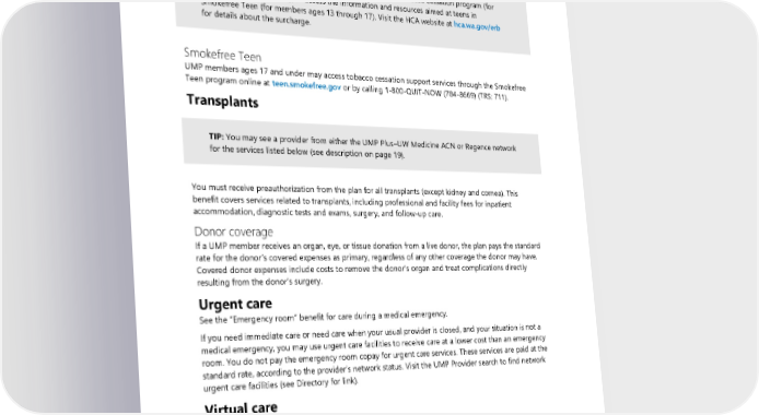 For nicotine replacement therapy, you may get supplies sent to you from the program or get a prescription from your provider and purchase as described under “Nicotine replacement therapy” on page 74. ALERT! You may attest for an exemption to the PEBB tobacco use premium surcharge if you or a dependent are tobacco-free for two months, enroll in the tobacco cessation program (for members age 18 or older), or access the information and resources aimed at teens in Smokefree Teen (for members ages 13 through 17). Visit the HCA website at hca.wa.gov/erb for details about the surcharge. Smokefree Teen UMP members ages 17 and under may access tobacco cessation support services through the Smokefree Teen program online at teen.smokefree.gov or by calling 1-800-QUIT-NOW (784-8669) (TRS: 711). Transplants TIP: You may see a provider from either the UMP Plus–UW Medicine ACN or Regence network for the services listed below (see description on page 19). You must receive preauthorization from the plan for all transplants (except kidney and cornea). This benefit covers services related to transplants, including professional and facility fees for inpatient accommodation, diagnostic tests and exams, surgery, and follow-up care. Donor coverage If a UMP member receives an organ, eye, or tissue donation from a live donor, the plan pays the standard rate for the donor’s covered expenses as primary, regardless of any other coverage the donor may have. Covered donor expenses include costs to remove the donor’s organ and treat complications directly resulting from the donor’s surgery. Urgent care See the “Emergency room” benefit for care during a medical emergency. If you need immediate care or need care when your usual provider is closed, and your situation is not a medical emergency, you may use urgent care facilities to receive care at a lower cost than an emergency room. You do not pay the emergency room copay for urgent care services. These services are paid at the standard rate, according to the provider’s network status. Visit the UMP Provider search to find network urgent care facilities (see Directory for link). Virtual care Telemedicine services Telemedicine is the delivery of health care services through audio and visual technology, allowing real- time communication between the member at the originating site and a provider for the purpose of diagnosis, consultation, or treatment. Telemedicine includes audio-only telemedicine. Telemedicine does not include the use of fax or email. “Store and forward technology” is a term used for the transfer of a member’s medical information from one health care provider to another at a distant site, which results in medical diagnosis and management 2024 UMP Plus–UW Medicine ACN (PEBB) Certificate of Coverage 75