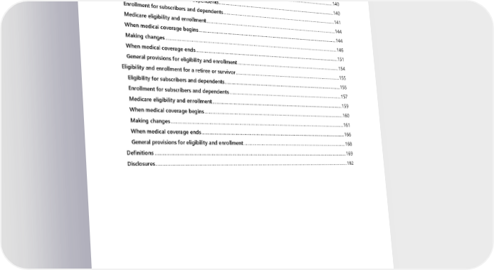 Governing law ............................................................................................................................................................................. 138 Anti-assignment ......................................................................................................................................................................... 138 No waiver ...................................................................................................................................................................................... 138 Acronyms ........................................................................................................................................................................................... 139 Eligibility and enrollment ........................................................................................................................................................... 140 Eligibility for subscribers and dependents ..................................................................................................................... 140 Enrollment for subscribers and dependents ................................................................................................................. 141 Medicare eligibility and enrollment .................................................................................................................................. 144 When medical coverage begins .......................................................................................................................................... 144 Making changes ......................................................................................................................................................................... 146 When medical coverage ends .............................................................................................................................................. 151 General provisions for eligibility and enrollment ....................................................................................................... 154 Eligibility and enrollment for a retiree or survivor .......................................................................................................... 155 Eligibility for subscribers and dependents ..................................................................................................................... 155 Enrollment for subscribers and dependents ................................................................................................................. 157 Medicare eligibility and enrollment .................................................................................................................................. 159 When medical coverage begins .......................................................................................................................................... 160 Making changes ......................................................................................................................................................................... 161 When medical coverage ends .............................................................................................................................................. 166 General provisions for eligibility and enrollment ....................................................................................................... 168 Definitions ......................................................................................................................................................................................... 169 Disclosures ......................................................................................................................................................................................... 192 12 2024 UMP Plus–UW Medicine ACN (PEBB) Certificate of Coverage