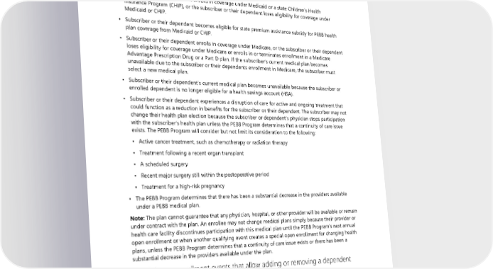 subscriber must select a new medical plan, as described in PEBB Program rules. If the subscriber does not elect a new medical plan as required, they will be enrolled in a PEBB medical plan designated by the director of HCA or their designee. • A court order requires the subscriber or any other individual to provide insurance coverage for an eligible dependent of the subscriber (a former spouse or former state-registered domestic partner is not an eligible dependent). • Subscriber or their dependent enrolls in coverage under Medicaid or a state Children’s Health Insurance Program (CHIP), or the subscriber or their dependent loses eligibility for coverage under Medicaid or CHIP. • Subscriber or their dependent becomes eligible for state premium assistance subsidy for PEBB health plan coverage from Medicaid or CHIP. • Subscriber or their dependent enrolls in coverage under Medicare, or the subscriber or their dependent loses eligibility for coverage under Medicare or enrolls in or terminates enrollment in a Medicare Advantage Prescription Drug or a Part D plan. If the subscriber’s current medical plan becomes unavailable due to the subscriber or their dependents enrollment in Medicare, the subscriber must select a new medical plan. • Subscriber or their dependent’s current medical plan becomes unavailable because the subscriber or enrolled dependent is no longer eligible for a health savings account (HSA). • Subscriber or their dependent experiences a disruption of care for active and ongoing treatment that could function as a reduction in benefits for the subscriber or their dependent. The subscriber may not change their health plan election because the subscriber or dependent’s physician stops participation with the subscriber’s health plan unless the PEBB Program determines that a continuity of care issue exists. The PEBB Program will consider but not limit its consideration to the following: ▪ Active cancer treatment, such as chemotherapy or radiation therapy ▪ Treatment following a recent organ transplant ▪ A scheduled surgery ▪ Recent major surgery still within the postoperative period ▪ Treatment for a high-risk pregnancy ▪ The PEBB Program determines that there has been a substantial decrease in the providers available under a PEBB medical plan. Note: The plan cannot guarantee that any physician, hospital, or other provider will be available or remain under contract with the plan. An enrollee may not change medical plans simply because their provider or health care facility discontinues participation with this medical plan until the PEBB Program’s next annual open enrollment or when another qualifying event creates a special open enrollment for changing health plans, unless the PEBB Program determines that a continuity of care issue exists or there has been a substantial decrease in the providers available under the plan. Special open enrollment events that allow adding or removing a dependent Any of the following events may create a special open enrollment: • Subscriber gains a new dependent due to: ▪ Marriage or registering a state-registered domestic partnership. ▪ Birth, adoption, or when the subscriber has assumed a legal obligation for total or partial support in anticipation of adoption. 2024 UMP Plus–UW Medicine ACN (PEBB) Certificate of Coverage 165