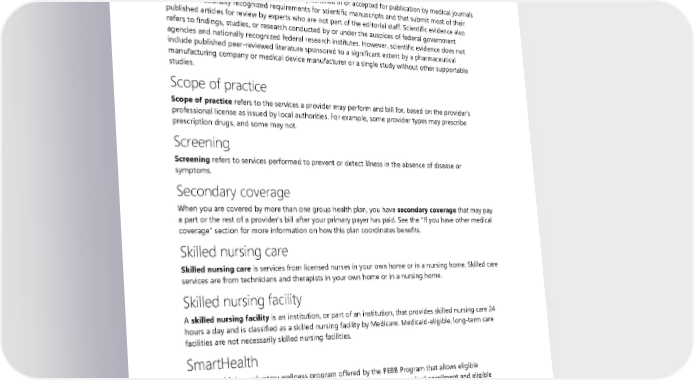 School Employees Benefits Board (SEBB) Program The School Employees Benefits Board (SEBB) Program is the program within HCA that administers insurance and other benefits for eligible school employees and eligible dependents. Scientific evidence Scientific evidence means scientific studies published in or accepted for publication by medical journals that meet nationally recognized requirements for scientific manuscripts and that submit most of their published articles for review by experts who are not part of the editorial staff. Scientific evidence also refers to findings, studies, or research conducted by or under the auspices of federal government agencies and nationally recognized federal research institutes. However, scientific evidence does not include published peer-reviewed literature sponsored to a significant extent by a pharmaceutical manufacturing company or medical device manufacturer or a single study without other supportable studies. Scope of practice Scope of practice refers to the services a provider may perform and bill for, based on the provider’s professional license as issued by local authorities. For example, some provider types may prescribe prescription drugs, and some may not. Screening Screening refers to services performed to prevent or detect illness in the absence of disease or symptoms. Secondary coverage When you are covered by more than one group health plan, you have secondary coverage that may pay a part or the rest of a provider’s bill after your primary payer has paid. See the “If you have other medical coverage” section for more information on how this plan coordinates benefits. Skilled nursing care Skilled nursing care is services from licensed nurses in your own home or in a nursing home. Skilled care services are from technicians and therapists in your own home or in a nursing home. Skilled nursing facility A skilled nursing facility is an institution, or part of an institution, that provides skilled nursing care 24 hours a day and is classified as a skilled nursing facility by Medicare. Medicaid-eligible, long-term care facilities are not necessarily skilled nursing facilities. SmartHealth SmartHealth is a voluntary wellness program offered by the PEBB Program that allows eligible subscribers to qualify for wellness incentives. Employees who waive medical enrollment and eligible retirees who defer PEBB retiree insurance coverage are not eligible to qualify for the incentive. Qualifying for the wellness incentive during the 2023 plan year reduces the subscriber’s 2024 plan year medical deductible by $125 to $0 if the subscriber is still eligible to participate in the wellness incentive program. Qualifying for the wellness incentive during the 2024 plan year reduces the subscriber’s 2025 plan year deductible by $125 to $0 if the subscriber is still eligible to participate in the wellness incentive 2024 UMP Plus–UW Medicine ACN (PEBB) Certificate of Coverage 189