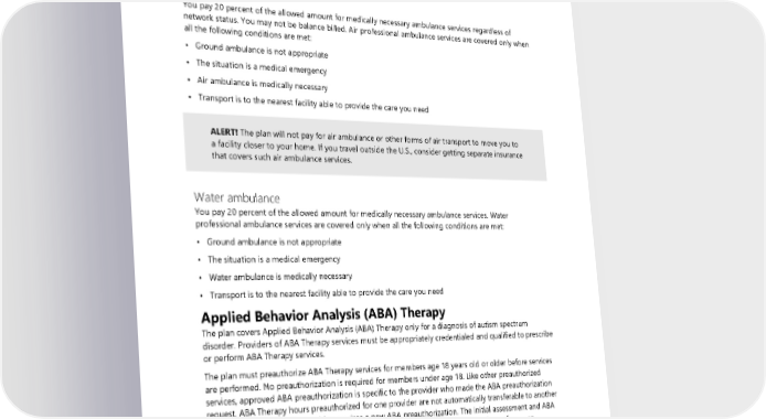 When other means of transportation are considered unsafe due to your medical condition, the plan covers professional ambulance services: • From one facility to another facility, for inpatient or outpatient treatment; • From home to a facility; or • From a facility to home. Air ambulance You pay 20 percent of the allowed amount for medically necessary ambulance services regardless of network status. You may not be balance billed. Air professional ambulance services are covered only when all the following conditions are met: • Ground ambulance is not appropriate • The situation is a medical emergency • Air ambulance is medically necessary • Transport is to the nearest facility able to provide the care you need ALERT! The plan will not pay for air ambulance or other forms of air transport to move you to a facility closer to your home. If you travel outside the U.S., consider getting separate insurance that covers such air ambulance services. Water ambulance You pay 20 percent of the allowed amount for medically necessary ambulance services. Water professional ambulance services are covered only when all the following conditions are met: • Ground ambulance is not appropriate • The situation is a medical emergency • Water ambulance is medically necessary • Transport is to the nearest facility able to provide the care you need Applied Behavior Analysis (ABA) Therapy The plan covers Applied Behavior Analysis (ABA) Therapy only for a diagnosis of autism spectrum disorder. Providers of ABA Therapy services must be appropriately credentialed and qualified to prescribe or perform ABA Therapy services. The plan must preauthorize ABA Therapy services for members age 18 years old or older before services are performed. No preauthorization is required for members under age 18. Like other preauthorized services, approved ABA preauthorization is specific to the provider who made the ABA preauthorization request. ABA Therapy hours preauthorized for one provider are not automatically transferable to another provider. A change in the provider requires a new ABA preauthorization. The initial assessment and ABA therapy treatment order or prescription do not require preauthorization for members of any age. As for other covered services, you receive the highest-level benefit by using network providers. See the “Types of services” section for differences in your cost for core, support, and out-of-network providers. To find a network provider, visit the UMP Provider search or contact UMP Customer Service. 2024 UMP Plus–UW Medicine ACN (PEBB) Certificate of Coverage 43