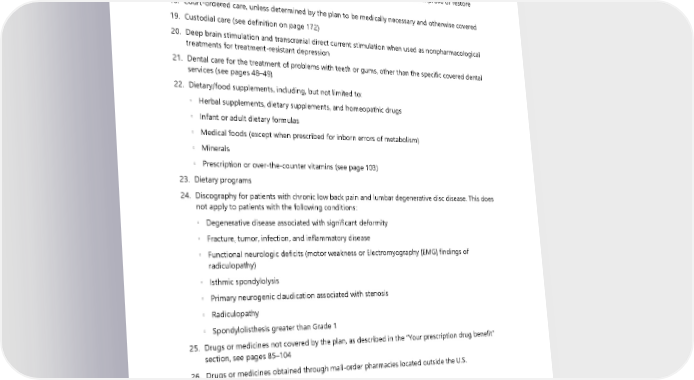 16. Coronary or cardiac artery calcium scoring 17. Cosmetic services or supplies, including drugs and pharmaceuticals, unless part of the following care: ◦ Reconstructive breast surgery following a mastectomy necessitated by disease, illness, or injury ◦ Reconstructive surgery of a congenital anomaly, such as cleft lip or palate, to improve or restore function 18. Court-ordered care, unless determined by the plan to be medically necessary and otherwise covered 19. Custodial care (see definition on page 172) 20. Deep brain stimulation and transcranial direct current stimulation when used as nonpharmacological treatments for treatment-resistant depression 21. Dental care for the treatment of problems with teeth or gums, other than the specific covered dental services (see pages 48–49) 22. Dietary/food supplements, including, but not limited to: ◦ Herbal supplements, dietary supplements, and homeopathic drugs ◦ Infant or adult dietary formulas ◦ Medical foods (except when prescribed for inborn errors of metabolism) ◦ Minerals ◦ Prescription or over-the-counter vitamins (see page 103) 23. Dietary programs 24. Discography for patients with chronic low back pain and lumbar degenerative disc disease. This does not apply to patients with the following conditions: ◦ Degenerative disease associated with significant deformity ◦ Fracture, tumor, infection, and inflammatory disease ◦ Functional neurologic deficits (motor weakness or Electromyography [EMG] findings of radiculopathy) ◦ Isthmic spondylolysis ◦ Primary neurogenic claudication associated with stenosis ◦ Radiculopathy ◦ Spondylolisthesis greater than Grade 1 25. Drugs or medicines not covered by the plan, as described in the “Your prescription drug benefit” section, see pages 85–104 26. Drugs or medicines obtained through mail-order pharmacies located outside the U.S. 27. Educational programs, except as described under: ◦ “Diabetes Control Program” on page 50 ◦ “Diabetes education” on page 50 ◦ “Diabetes Prevention Program” on page 51 ◦ “Tobacco cessation services” on page 73 108 2024 UMP Plus–UW Medicine ACN (PEBB) Certificate of Coverage