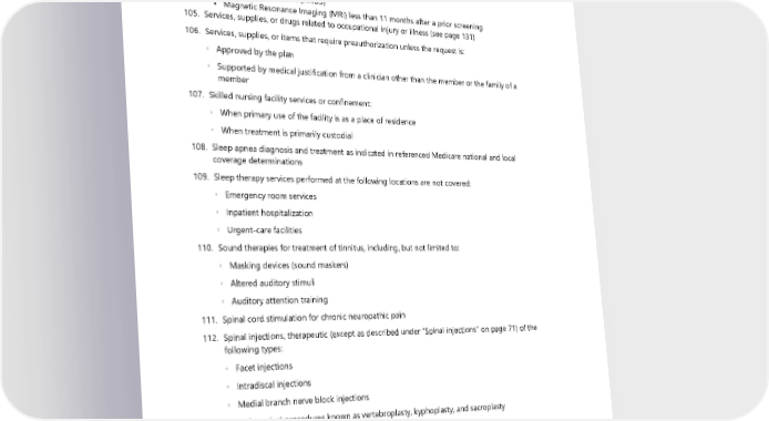 ◦ Non-high-risk patients: • Automated Breast Ultrasound (ABUS) • Handheld Ultrasound (HHUS) • Magnetic Resonance Imaging (MRI) ◦ High-risk patients: • Automated breast ultrasound (ABUS) • Handheld Ultrasound (HHUS) • Magnetic Resonance Imaging (MRI) less than 11 months after a prior screening 105. Services, supplies, or drugs related to occupational injury or illness (see page 131) 106. Services, supplies, or items that require preauthorization unless the request is: ◦ Approved by the plan ◦ Supported by medical justification from a clinician other than the member or the family of a member 107. Skilled nursing facility services or confinement: ◦ When primary use of the facility is as a place of residence ◦ When treatment is primarily custodial 108. Sleep apnea diagnosis and treatment as indicated in referenced Medicare national and local coverage determinations 109. Sleep therapy services performed at the following locations are not covered: ◦ Emergency room services ◦ Inpatient hospitalization ◦ Urgent-care facilities 110. Sound therapies for treatment of tinnitus, including, but not limited to: ◦ Masking devices (sound maskers) ◦ Altered auditory stimuli ◦ Auditory attention training 111. Spinal cord stimulation for chronic neuropathic pain 112. Spinal injections, therapeutic (except as described under “Spinal injections” on page 71) of the following types: ◦ Facet injections ◦ Intradiscal injections ◦ Medial branch nerve block injections 113. Spinal surgical procedures known as vertebroplasty, kyphoplasty, and sacroplasty 114. Stem cell therapies for musculoskeletal conditions 115. Stereotactic body radiation therapy for the treatment of primary tumor of the following cancer types: ◦ Bone ◦ Head and neck 114 2024 UMP Plus–UW Medicine ACN (PEBB) Certificate of Coverage
