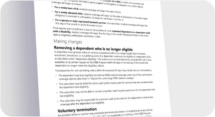 For a retiree, a survivor, or their eligible dependents enrolling during a special open enrollment, medical coverage begins the first of the month following the later of the event date or the date the online enrollment election using Benefits 24/7 (once available) or the required form is received. If that day is the first of the month, medical coverage begins on that day, except for a Medicare Advantage or Medicare Advantage Prescription Drug plan, which will begin the first day of the month following the date the enrollment election is received online or the required from is received by the PEBB Program. If the special open enrollment is due to the birth or adoption of a child, or when the subscriber has assumed a legal obligation for total or partial support in anticipation of adoption of a child, medical coverage will begin as follows: • For a newly born child, medical coverage will begin the date of birth; • For a newly adopted child, medical coverage will begin on the date of placement or the date a legal obligation is assumed in anticipation of adoption, whichever is earlier; or • For a spouse or state registered domestic partner of a subscriber, medical coverage will begin the first day of the month in which the event occurs. If the special open enrollment is due to the enrollment of an extended dependent or a dependent child with a disability, medical coverage will begin the first day of the month following the later of the event date or eligibility certification, whichever is later. Making changes Removing a dependent who is no longer eligible A subscriber must provide notice to remove a dependent who is no longer eligible due to divorce, annulment, dissolution, or a qualifying event of a dependent ceasing to be eligible as a dependent child, as described under “Dependent eligibility.” The notice must be received online using Benefits 24/7 (once available) or by written request to the PEBB Program within 60 days of the last day of the month the dependent no longer meets the eligibility criteria. Consequences for not submitting notice within the required 60 days may include, but are not limited to: • The dependent may lose eligibility to continue PEBB medical coverage under one of the continuation coverage options described in “Options for continuing PEBB medical coverage.” • The subscriber may be billed for claims paid by the medical plan for services that were rendered after the dependent lost eligibility. • The subscriber may not be able to recover subscriber-paid insurance premiums for the dependent that lost eligibility. • The subscriber may be responsible for premiums paid by the state for the dependent’s medical plan coverage after the dependent lost eligibility. Voluntary termination An enrolled retiree or survivor may voluntarily terminate enrollment in a medical plan at any time by submitting a request online using Benefits 24/7 (once available) or in writing to the PEBB Program. Enrollment in the medical plan will be terminated the last day of the month in which the request is received online or by the PEBB Program, or on the last day of the month specified in the termination request, whichever is later. If the request is received on the first day of the month, medical plan enrollment will be terminated on the last day of the previous month. When a retiree, a survivor, or their dependent is enrolled in a Medicare Advantage or Medicare Advantage Prescription Drug plan, medical plan enrollment will be terminated on the last day of the month when the PEBB Medicare Advantage Plan Disenrollment Form (form D) is received. 2024 UMP Plus–UW Medicine ACN (PEBB) Certificate of Coverage 161