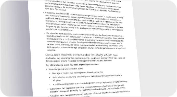Program will require the subscriber to provide proof of the dependent’s eligibility, evidence of the event that created the special open enrollment, or both. Exceptions: • A subscriber enrolled in PEBB retiree insurance coverage has six months from the date of their or their dependent’s enrollment in Medicare Part B to change their enrollment to a PEBB Medicare Supplement Plan. The change must be made online or the PEBB Program must receive the required form(s) no later than six months after the enrollment in Medicare Part B for either the subscriber or their dependent. • When a subscriber or their dependent is enrolled in an MA or MAPD plan, they may disenroll during a special enrollment period as allowed under federal regulations. The new medical plan coverage will begin the first day of the month following the date the PEBB Medicare Advantage Plan Disenrollment Form (form D) is received. • A subscriber enrolled in PEBB retiree insurance coverage has seven months to enroll in an MA or MAPD plan that begins three months before they or their dependent first enrolled in both Medicare Part A and Part B and ends three months after the month of Medicare eligibility. A subscriber may also enroll themselves or their dependent in an MA or MAPD plan before their last day of the Medicare Part B initial enrollment period. The change must be made online or the forms must be received by the PEBB Program no later than the last day of the month prior to the month the subscriber or their dependent enrolls in the MA or MAPD plan. • If a subscriber wants to enroll a newborn or child whom the subscriber has adopted or has assumed a legal obligation for total or partial support in anticipation of adoption, the subscriber should complete the request online or notify the PEBB Program by submitting the required form(s) as soon as possible to ensure timely payment of claims. If adding the child increases the premium, the request must be received online, or the required form(s) must be received no later than 60 days after the date of the birth, adoption, or the date the legal obligation is assumed for total or partial support in anticipation of adoption. Special open enrollment events that allow for a change in health plans A subscriber may not change their health plan during a special open enrollment if their state-registered domestic partner or state-registered domestic partner’s child is not a tax dependent. Any of the following events may create a special open enrollment: • Subscriber gains a new dependent due to: ▪ Marriage or registering a state-registered domestic partnership. ▪ Birth, adoption, or assuming a legal obligation for total or partial support in anticipation of adoption. ▪ A child becoming eligible as an extended dependent through legal custody or legal guardianship. • Subscriber or their dependent loses other coverage under a group health plan or through health insurance coverage, as defined by the Health Insurance Portability and Accountability Act (HIPAA). • Subscriber has a change in employment status that affects their eligibility for the employer contribution toward their employer-based group health plan. • Subscriber’s dependent has a change in their own employment status that affects their eligibility or their dependent’s eligibility for the employer contribution under their employer-based group health plan. “Employer contribution” means contributions made by the dependent’s current or former employer toward health coverage as described in the Treasury Regulation. • Subscriber or their dependent has a change in residence that affects health plan availability. If the subscriber has a change in residence and their current medical plan is no longer available, the 164 2024 UMP Plus–UW Medicine ACN (PEBB) Certificate of Coverage