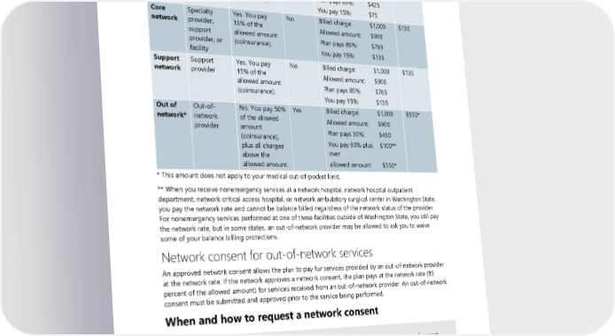 Network Provider Must provider Balance Itemized payments You owe type type/ accept allowed billing provider service amount? allowed? Core Related Yes. You pay No Billed charge: $600 $75 network services with 15% of the Allowed amount: $500 a PCP (labs, allowed amount Plan pays 85%: $425 x-rays, etc.) (coinsurance). You pay 15%: $75 Core Specialty Yes. You pay No Billed charge: $1,000 $135 network provider, 15% of the Allowed amount: $900 support allowed amount Plan pays 85%: $765 provider, or (coinsurance). You pay 15%: $135 facility Support Support Yes. You pay No Billed charge: $1,000 $135 network provider 15% of the Allowed amount: $900 allowed amount Plan pays 85%: $765 (coinsurance). You pay 15%: $135 Out of Out-of- No. You pay 50% Yes Billed charge: $1,000 $550* network* network of the allowed Allowed amount: $900 provider amount Plan pays 50%: $450 (coinsurance), You pay 50% plus $100** plus all charges over above the allowed amount: $550* allowed amount. * This amount does not apply to your medical out-of-pocket limit. ** When you receive nonemergency services at a network hospital, network hospital outpatient department, network critical access hospital, or network ambulatory surgical center in Washington State, you pay the network rate and cannot be balance billed regardless of the network status of the provider. For nonemergency services performed at one of these facilities outside of Washington State, you still pay the network rate, but in some states, an out-of-network provider may be allowed to ask you to waive some of your balance billing protections. Network consent for out-of-network services An approved network consent allows the plan to pay for services provided by an out-of-network provider at the network rate. If the network approves a network consent, the plan pays at the network rate (85 percent of the allowed amount) for services received from an out-of-network provider. An out-of-network consent must be submitted and approved prior to the service being performed. When and how to request a network consent ALERT! If the network approves a network consent, you must still pay your cost-share for most medical services. Services provided under an approved network consent apply to your medical deductible and out-of-pocket limit. Network consent for ongoing services may require periodic review. 2024 UMP Plus–UW Medicine ACN (PEBB) Certificate of Coverage 23