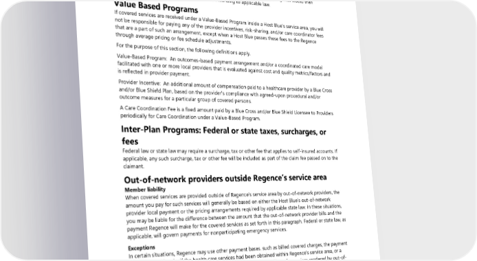 Estimated pricing and average pricing, going forward, also take into account adjustments to correct for over- or underestimation of modifications of past pricing of claims, as noted above. However, such adjustments will not affect the price Regence BlueShield uses for your claim because they will not be applied after a claim has already been paid. Laws in a small number of states may require the Host Blue to add a surcharge to your calculation. If any state laws mandate other liability calculation methods, including a surcharge, Regence would then calculate your liability for any covered services according to applicable law. Value Based Programs If covered services are received under a Value-Based Program inside a Host Blue's service area, you will not be responsible for paying any of the provider incentives, risk-sharing, and/or care coordinator fees that are a part of such an arrangement, except when a Host Blue passes these fees to the Regence through average pricing or fee schedule adjustments. For the purpose of this section, the following definitions apply. Value-Based Program: An outcomes-based payment arrangement and/or a coordinated care model facilitated with one or more local providers that is evaluated against cost and quality metrics/factors and is reflected in provider payment. Provider Incentive: An additional amount of compensation paid to a healthcare provider by a Blue Cross and/or Blue Shield Plan, based on the provider's compliance with agreed-upon procedural and/or outcome measures for a particular group of covered persons. A Care Coordination Fee is a fixed amount paid by a Blue Cross and/or Blue Shield Licensee to Providers periodically for Care Coordination under a Value-Based Program. Inter-Plan Programs: Federal or state taxes, surcharges, or fees Federal law or state law may require a surcharge, tax or other fee that applies to self-insured accounts. If applicable, any such surcharge, tax or other fee will be included as part of the claim fee passed on to the claimant. Out-of-network providers outside Regence’s service area Member liability When covered services are provided outside of Regence’s service area by out-of-network providers, the amount you pay for such services will generally be based on either the Host Blue’s out-of-network provider local payment or the pricing arrangements required by applicable state law. In these situations, you may be liable for the difference between the amount that the out-of-network provider bills and the payment Regence will make for the covered services as set forth in this paragraph. Federal or state law, as applicable, will govern payments for nonparticipating emergency services. Exceptions In certain situations, Regence may use other payment bases. such as billed covered charges, the payment Regence would make if the health care services had been obtained within Regence’s service area, or a special negotiated payment, to determine the amount Regence will pay for services rendered by out-of- network providers. In these situations, you may be liable for the difference between the amount that the out-of-network provider bills and the payment Regence will make for the covered services as set forth in this paragraph. 26 2024 UMP Plus–UW Medicine ACN (PEBB) Certificate of Coverage