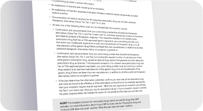 Your prescribing provider can also use CoverMyMeds to request an exception. CoverMyMeds is a free online platform that reviews exception requests from electronic health record systems or directly through the CoverMyMeds portal. To get started, have your provider visit the CoverMyMeds website (see Directory for link). Preferred drug list exceptions and coverage determinations require medical information and are based on medical necessity. Therefore, your prescribing provider must submit clinical information for review and will need to provide WSRxS with the following information: • The prescribing provider’s contact information; • An explanation of why the plan should grant an exception; • An explanation of how the requested medication therapy is evidence-based and generally accepted medical practice; • Documentation of medical necessity for the requested prescription drug over all other preferred therapeutic alternatives (Value Tier, Tier 1, and Tier 2); and • At least one of the following items must also be included with the exception request: ▪ Confirmation and documentation from your prescribing provider that all preferred therapeutic alternatives (Value Tier, Tier 1, and Tier 2) were tried for a clinically appropriate duration of treatment and failed to produce a therapeutic response. If the requested exception is for a brand-name prescription drug that has an FDA-approved generic equivalent, your prescribing provider must document your inadequate response to at least two manufacturers of the generic drug, or to all manufacturers of the generic drug if there are fewer than two manufacturers, in addition to all other preferred therapeutic alternatives before an exception is granted; or ▪ Confirmation and documentation from your prescribing provider that all preferred therapeutic alternatives (Value Tier, Tier 1, and Tier 2), including the required number of manufacturers of the same generic prescription drug, caused an adverse drug reaction that prevents you from taking the prescription drug as directed. If the requested exception is for a brand-name prescription drug that has an FDA-approved generic equivalent, your prescribing provider must document your adverse drug reaction to at least two manufacturers of the generic drug, or to all manufacturers of the generic drug if there are fewer than two manufacturers, in addition to all other preferred therapeutic alternatives, before an exception is granted. ▪ If the plan determines the information submitted confirms you have tried all the alternative drugs and none are found to be effective, or if the alternatives are found to not be medically appropriate, then your exception request may be approved. When the plan approves an exception, you will pay the Tier 2 cost-share (see “what you pay for prescription drugs”). If your exception request is denied, the plans response letter will include the reason for the denial and the steps you can take next. ALERT! The exception process for noncovered drugs cannot be used for drugs that UMP excludes. For more information about drugs UMP excludes, see the “Prescription drugs and products UMP does not cover” and the “What the plan does not cover” sections. How UMP decides which prescription drugs are preferred Washington State P&T Committee and WSRxS P&T Committee provide recommendations to HCA. WSRxS and HCA review the recommendations and determine which medications are included on the UMP Preferred Drug List, as well as the tier level. The UMP Preferred Drug List includes the committees’ coverage recommendations. 2024 UMP Plus–UW Medicine ACN (PEBB) Certificate of Coverage 87