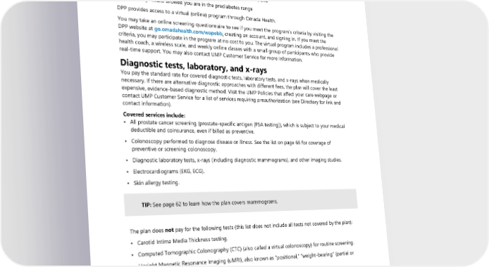 Diabetes Prevention Program (DPP) You may be eligible for DPP if: • You are not a Medicare member; • You are age 18 and older; • Your provider ordered a blood sugar test in the last 12 months; and • Laboratory results showed you are in the prediabetes range DPP provides access to a virtual (online) program through Omada Health. You may take an online screening questionnaire to see if you meet the program’s criteria by visiting the DPP website at go.omadahealth.com/wapebb, creating an account, and signing in. If you meet the criteria, you may participate in the program at no cost to you. The virtual program includes a professional health coach, a wireless scale, and weekly online classes with a small group of participants who provide real-time support. You may also contact UMP Customer Service for more information. Diagnostic tests, laboratory, and x-rays You pay the standard rate for covered diagnostic tests, laboratory tests, and x-rays when medically necessary. If there are alternative diagnostic approaches with different fees, the plan will cover the least expensive, evidence-based diagnostic method. Visit the UMP Policies that affect your care webpage or contact UMP Customer Service for a list of services requiring preauthorization (see Directory for link and contact information). Covered services include: • All prostate cancer screening (prostate-specific antigen [PSA testing]), which is subject to your medical deductible and coinsurance, even if billed as preventive. • Colonoscopy performed to diagnose disease or illness. See the list on page 66 for coverage of preventive or screening colonoscopy. • Diagnostic laboratory tests, x-rays (including diagnostic mammograms), and other imaging studies. • Electrocardiograms (EKG, ECG). • Skin allergy testing. TIP: See page 62 to learn how the plan covers mammograms. The plan does not pay for the following tests (this list does not include all tests not covered by the plan): • Carotid Intima Media Thickness testing. • Computed Tomographic Colonography (CTC) (also called a virtual colonoscopy) for routine screening. • Upright Magnetic Resonance Imaging (uMRI), also known as “positional,” “weight-bearing” (partial or full), or “axial loading.” 2024 UMP Plus–UW Medicine ACN (PEBB) Certificate of Coverage 51