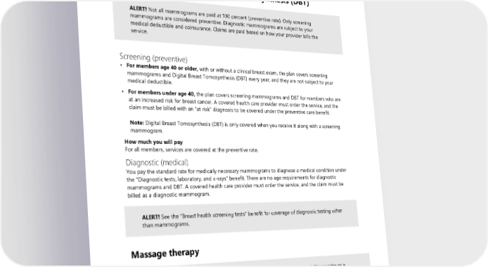 • Total knee arthroplasty performed with computer navigation is covered. • For individuals with unicompartmental disease, unicompartmental partial knee arthroplasty is covered. • Multi-compartmental partial knee arthroplasty (including bicompartmental and bi-unicompartmental) is not covered. Mammogram and Digital Breast Tomosynthesis (DBT) ALERT! Not all mammograms are paid at 100 percent (preventive rate). Only screening mammograms are considered preventive. Diagnostic mammograms are subject to your medical deductible and coinsurance. Claims are paid based on how your provider bills the service. Screening (preventive) • For members age 40 or older, with or without a clinical breast exam, the plan covers screening mammograms and Digital Breast Tomosynthesis (DBT) every year, and they are not subject to your medical deductible. • For members under age 40, the plan covers screening mammograms and DBT for members who are at an increased risk for breast cancer. A covered health care provider must order the service, and the claim must be billed with an “at risk” diagnosis to be covered under the preventive care benefit. Note: Digital Breast Tomosynthesis (DBT) is only covered when you receive it along with a screening mammogram. How much you will pay For all members, services are covered at the preventive rate. Diagnostic (medical) You pay the standard rate for medically necessary mammograms to diagnose a medical condition under the “Diagnostic tests, laboratory, and x-rays” benefit. There are no age requirements for diagnostic mammograms and DBT. A covered health care provider must order the service, and the claim must be billed as a diagnostic mammogram. ALERT! See the “Breast health screening tests” benefit for coverage of diagnostic testing other than mammograms. Massage therapy Support network provider type: You must use a UMP Plus–UW Medicine ACN provider or a covered provider within the support network to receive network level benefits (see description in the “Support network providers” section). The plan covers up to 24 visits per calendar year for massage therapy (no more than 90 minutes per visit). See the definition of “Limited benefit”. You pay the special rate (a $15 copay) for up to 24 massage 62 2024 UMP Plus–UW Medicine ACN (PEBB) Certificate of Coverage