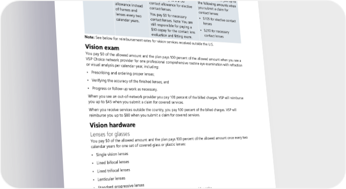 Benefit Frequency Your cost with a VSP Your cost with an out-of- Choice network provider network provider Contacts One set of contact You pay $30 copay for a You pay 100% of billed lenses or contact lens evaluation and charges. disposable contact fitting exam. VSP will reimburse you up to lenses up to the You pay $0 up to a $150 the following amounts when maximum contact allowance for elective you submit a claim for allowance instead contact lenses. contact lenses: of frames and You pay $0 for necessary • $105 for elective contact lenses every two contact lenses. Note: You are lenses calendar years. still responsible for paying a • $210 for necessary $30 copay for the contact lens contact lenses evaluation and fitting exam. Note: See below for reimbursement rates for vision services received outside the U.S. Vision exam You pay $0 of the allowed amount and the plan pays 100 percent of the allowed amount when you see a VSP Choice network provider for one professional comprehensive routine eye examination with refraction or visual analysis per calendar year, including: • Prescribing and ordering proper lenses; • Verifying the accuracy of the finished lenses; and • Progress or follow-up work as necessary. When you see an out-of-network provider you pay 100 percent of the billed charges. VSP will reimburse you up to $45 when you submit a claim for covered services. When you receive services outside the country, you pay 100 percent of the billed charges. VSP will reimburse you up to $80 when you submit a claim for covered services. Vision hardware Lenses for glasses You pay $0 of the allowed amount and the plan pays 100 percent of the allowed amount once every two calendar years for one set of covered glass or plastic lenses: • Single vision lenses • Lined bifocal lenses • Lined trifocal lenses • Lenticular lenses • Standard progressive lenses • Lens enhancement covered for dependent children age 19 or older only: ▪ Impact-resistant coating When you see an out-of-network provider you pay 100 percent of the billed charges. When you submit a claim for covered lenses, VSP will reimburse you up to the following amounts: • $30 single vision lenses • $50 lined bifocal/standard progressive lenses 2024 UMP Plus–UW Medicine ACN (PEBB) Certificate of Coverage 79