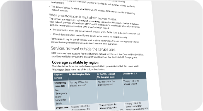 When your network provider affiliated with UMP Plus–UW Medicine ACN determines you need covered medically necessary services not available within your UMP Plus–UW Medicine ACN network, that provider submits a network consent request to the network for consideration by calling UMP Plus–UW Medicine ACN Customer Service at 1-888-402-4237 (TRS: 711) or contact UMP Customer Service. If they approve the network consent, the network will fax it to the plan before the services are provided. The fact that a provider may prescribe or provide a service or supply does not, by itself, make it a medically necessary covered service or supply. The network consent must include the following: • Information about the out-of-network provider and/or facility, such as name, address, and Tax ID number (TIN). • The dates of service for which your UMP Plus–UW Medicine ACN network provider is requesting network consent. When preauthorization is required with network consent The services you receive through network consent may also require UMP preauthorization. In that case, your network provider affiliated with UMP Plus–UW Medicine ACN must include information relevant to both the network consent and the UMP preauthorization request: • The information about the out-of-network provider and/or facility listed in the previous section; and • Clinical documentation needed for the plan to review services for medical necessity. For the plan to pay for out-of-network services at the network rate, the plan must approve a network consent before you receive services. A network consent is not guaranteed. Services received outside the service area UMP members have access to Regence BlueShield network providers and Blue Cross and Blue Shield Plan providers worldwide through the BlueCard® and Blue Cross Blue Shield Global® Core programs. Coverage available by region The table below shows the medical coverage available to you outside the UMP Plus service area in Washington State, in the rest of the U.S., and worldwide. Type of In Washington State In the U.S. (except Outside the U.S. service Washington State) Emergency You pay 15% of the You pay 15% of the You pay 15% of the room (ER) allowed amount* allowed amount* allowed amount See “Emergency room” benefit for details. Urgent care You pay 15% of the You pay 15% of the You pay 15% of the See “Urgent allowed amount for allowed amount for allowed amount for care” benefit network providers and 50% network providers and 50% network providers and 50% for details. of the allowed amount for of the allowed amount for of the allowed amount for out-of-network providers.* out-of-network providers.* out-of-network providers. 24 2024 UMP Plus–UW Medicine ACN (PEBB) Certificate of Coverage