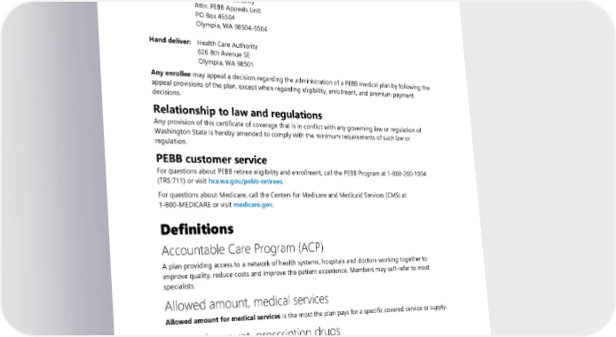 Appeal rights Any enrollee may appeal a decision made by the PEBB Program regarding PEBB eligibility, enrollment, premium payments, or premium surcharges to the PEBB Appeals Unit. Learn more at hca.wa.gov/pebb-appeals. Fax: 360-763-4709 Mail: Health Care Authority Attn: PEBB Appeals Unit PO Box 45504 Olympia, WA 98504-5504 Hand deliver: Health Care Authority 626 8th Avenue SE Olympia, WA 98501 Any enrollee may appeal a decision regarding the administration of a PEBB medical plan by following the appeal provisions of the plan, except when regarding eligibility, enrollment, and premium payment decisions. Relationship to law and regulations Any provision of this certificate of coverage that is in conflict with any governing law or regulation of Washington State is hereby amended to comply with the minimum requirements of such law or regulation. PEBB customer service For questions about PEBB retiree eligibility and enrollment, call the PEBB Program at 1-800-200-1004 (TRS:711) or visit hca.wa.gov/pebb-retirees. For questions about Medicare, call the Centers for Medicare and Medicaid Services (CMS) at 1-800-MEDICARE or visit medicare.gov. Definitions Accountable Care Program (ACP) A plan providing access to a network of health systems, hospitals and doctors working together to improve quality, reduce costs and improve the patient experience. Members may self-refer to most specialists. Allowed amount, medical services Allowed amount for medical services is the most the plan pays for a specific covered service or supply. Allowed amount, prescription drugs The allowed amount for prescription drugs is based on WSRxS’ contractually agreed reimbursement, unless other contractual arrangements or terms apply. All covered prescription drug claims are paid based on this allowed amount. 2024 UMP Plus–UW Medicine ACN (PEBB) Certificate of Coverage 169