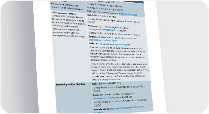 Directory Directory: medical services Contact type and description Contact information UMP Plus–UW Medicine ACN Call: 1-888-402-4237 (TRS: 711) Contact Center Monday–Friday: 5 a.m. to 8 p.m. (Pacific) Find network providers and Saturday–Sunday: 6 a.m. to 2 p.m. (Pacific) request out-of-network consent Visit: UMP Plus network website at pebb.uwmedicine.org UMP Customer Service Call: 1-888-849-3681 (TRS: 711) Contact UMP Customer Service Monday–Friday: 5 a.m. to 8 p.m.; Saturday: 8 a.m. to 4:30 p.m. for questions about your medical (Pacific) benefits, including information on Chat now: Sign in to your Regence account at behavioral health support ump.regence.com/ump/signin to chat now services, the expert second Monday–Friday: 5 a.m. to 8 p.m.; Saturday: 8 a.m. to 4:30 p.m. opinion program, your care Email: Send secure email via your Regence account at management benefit, and more. ump.regence.com/ump/signin Visit: UMP website at ump.regence.com/pebb If you are outside the U.S. and you have questions about your benefits and coverage, you can use email, chat now, or Skype to contact UMP Customer Service. You may request to have a customer service representative contact you at a scheduled time during normal business hours. If you are outside the U.S. and need to find a local provider, make an appointment, or be hospitalized, call Blue Cross Blue Shield Global® Core at 1-800-810-2583 or call collect at 1-804-673-1177, 24 hours a day, 7 days a week. You can also use the online provider search tool on the Blue Cross Blue Shield Global Core website at bcbsglobalcore.com. Network provider directory Call: 1-888-849-3681 (TRS: 711) Monday–Friday: 5 a.m. to 8 p.m.; Saturday: 8 a.m. to 4:30 p.m. (Pacific) Chat now: Sign in to your Regence account at ump.regence.com/ump/signin to chat now Monday–Friday: 5 a.m. to 8 p.m.; Saturday: 8 a.m. to 4:30 p.m. (Pacific) Provider search ump.regence.com/go/PEBB/UMP-Plus- UWMACN 2024 UMP Plus–UW Medicine ACN (PEBB) Certificate of Coverage 1