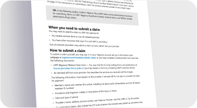 Billing and payment: submitting a claim Submitting a claim for medical services When UMP is your primary insurance and your provider is a network provider, you do not need to submit claims. The provider will do it for you. If you have a question about whether your provider’s office has submitted a claim, sign in to your Regence account or contact UMP Customer Service (see Directory for link and contact information). See the “Submitting a Blue Cross Blue Shield Global® Core claim” section on page 27 for instructions on submitting a claim for services received outside of the United States. TIP: In the following section, Uniform Medical Plan (UMP) refers to the administrative functions for submitting claims to UMP. Regence BlueShield handles medical claims, and WSRxS handles prescription drugs claims. When you need to submit a claim You may need to submit a claim to UMP for payment if: • You receive services from an out-of-network provider. • You have other insurance that pays first and UMP is secondary. Out-of-network providers may submit a claim on your behalf. Ask your provider. How to submit a claim To submit a claim yourself, you may sign in to your Regence account and go to the Submit claim webpage at regence.com/member/submit-claim/ or you may complete a medical claim form and mail the following documents: • UMP (Regence) Medical Claim Form — You may find the form by visiting forms and publications at hca.wa.gov/ump-forms-pubs or you may request a form by contacting UMP Customer Service. • An itemized bill from your provider that describes the services you received and the charges. The following information must appear on the provider’s itemized bill for the plan to consider the claim for payment: • Member’s name and member ID number, including the alpha prefix (three letters and the ‘W’ before member ID number) • Procedure and diagnosis code(s) or description of the injury or illness • Date and type of service • Provider’s name, address, phone number, and National Provider Identifier (NPI) or Tax ID number • For ambulance claims, also include the ZIP code of where the member was picked up and where they were taken If UMP is secondary, you must include a copy of your primary plan’s Explanation of Benefits, which lists the services covered and how much the other plan paid. You should wait until the primary plan has paid to submit a secondary claim to UMP, unless the primary plan’s processing of the claim is delayed. Claims not submitted to UMP within 12 months of the date of service will not be paid. If we must request additional information, the processing of your claim may be delayed. Note: Be sure to make copies of your documents for your records. 122 2024 UMP Plus–UW Medicine ACN (PEBB) Certificate of Coverage
