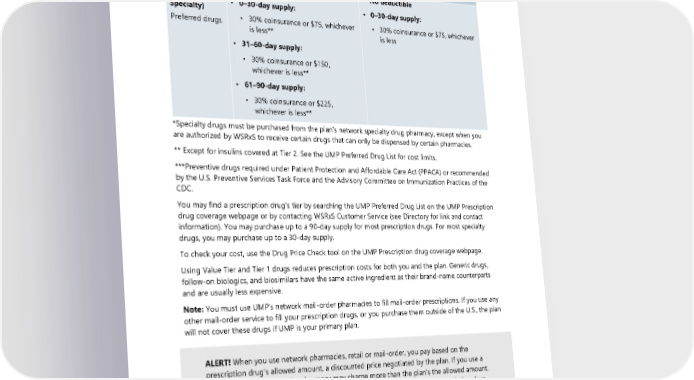 Tier and Nonspecialty drugs Specialty drugs* description All network pharmacies (retail and mail-order) ▪ 10% coinsurance or $75, whichever is less Tier 2 (Tier • No deductible • No deductible 2/Tier 2 • 0–30-day supply: • 0–30-day supply: Specialty) ▪ 30% coinsurance or $75, whichever ▪ 30% coinsurance or $75, whichever Preferred drugs is less** is less • 31–60-day supply: ▪ 30% coinsurance or $150, whichever is less** • 61–90-day supply: ▪ 30% coinsurance or $225, whichever is less** *Specialty drugs must be purchased from the plan’s network specialty drug pharmacy, except when you are authorized by WSRxS to receive certain drugs that can only be dispensed by certain pharmacies. ** Except for insulins covered at Tier 2. See the UMP Preferred Drug List for cost limits. ***Preventive drugs required under Patient Protection and Affordable Care Act (PPACA) or recommended by the U.S. Preventive Services Task Force and the Advisory Committee on Immunization Practices of the CDC. You may find a prescription drug’s tier by searching the UMP Preferred Drug List on the UMP Prescription drug coverage webpage or by contacting WSRxS Customer Service (see Directory for link and contact information). You may purchase up to a 90-day supply for most prescription drugs. For most specialty drugs, you may purchase up to a 30-day supply. To check your cost, use the Drug Price Check tool on the UMP Prescription drug coverage webpage. Using Value Tier and Tier 1 drugs reduces prescription costs for both you and the plan. Generic drugs, follow-on biologics, and biosimilars have the same active ingredient as their brand-name counterparts and are usually less expensive. Note: You must use UMP’s network mail-order pharmacies to fill mail-order prescriptions. If you use any other mail-order service to fill your prescription drugs, or you purchase them outside of the U.S., the plan will not cover these drugs if UMP is your primary plan. ALERT! When you use network pharmacies, retail or mail-order, you pay based on the prescription drug’s allowed amount, a discounted price negotiated by the plan. If you use a non-network pharmacy, the pharmacy may charge more than the plan’s the allowed amount. You will have to pay this additional amount, which does not apply to your prescription drug out-of-pocket limit. Prescriptions purchased from an excluded pharmacy are not covered. See the definition of “Excluded pharmacy.” 2024 UMP Plus–UW Medicine ACN (PEBB) Certificate of Coverage 91