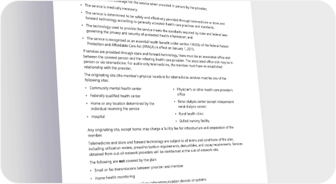 of the covered person. The purpose of telemedicine and store and forward technology is diagnosis, consultation, or treatment of the member. It does not include the use of fax or email. If you see a network provider, telemedicine services are paid at the network rate. If you see an out-of- network provider, telemedicine services are paid at the out-of-network rate. The plan covers store and forward technology and telemedicine from authorized originating sites under the medical benefit if: • The plan provides coverage for the service when provided in person by the provider; • The service is medically necessary; • The service is determined to be safely and effectively provided through telemedicine or store and forward technology according to generally accepted health care practices and standards; • The technology used to provide the service meets the standards required by state and federal laws governing the privacy and security of protected health information; and • The service is recognized as an essential health benefit under section 1302(b) of the federal Patient Protection and Affordable Care Act (PPACA) in effect on January 1, 2015. If services are provided through store and forward technology, there must be an associated office visit between the covered person and the referring health care provider. The associated office visit may be in person or via telemedicine. For audio-only telemedicine, the member must have an established relationship with the provider. The originating site (the member’s physical location) for telemedicine services must be one of the following sites: • Community mental health center • Physician's or other health care provider's • Federally qualified health center office • Home or any location determined by the • Renal dialysis center (except independent individual receiving the service renal dialysis center) • Hospital • Rural health clinic • Skilled nursing facility Any originating site, except home, may charge a facility fee for infrastructure and preparation of the member. Telemedicine and store and forward technology are subject to all terms and conditions of the plan, including utilization review, preauthorization requirements, deductibles, and copay requirements. Services obtained from out-of-network providers will be reimbursed at the out-of-network rate. The following are not covered by the plan: • Email or fax transmissions between provider and member • Home health monitoring • Installation or maintenance of any telecommunication devices or systems • Originating sites’ professional fees • Services that are not medically necessary • Services that would not be covered if delivered in person • Store and forward technology without an associated office visit between the covered member and the referring health care provider 76 2024 UMP Plus–UW Medicine ACN (PEBB) Certificate of Coverage
