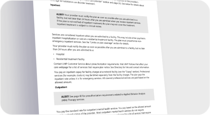 without your informed consent in states that allow you to waive the federal balance billing protections. When you receive emergency services you pay the network cost-sharing amount regardless of the network status of the provider or facility and cannot be balance billed. Mental health The plan covers mental health services for members with neuropsychiatric and mental health conditions. Marriage or family counseling is not covered. The amount the plan pays depends on the provider’s network status (see the “Finding a health care provider” section and page 35). See below for details about coverage for substance use disorder treatment. Inpatient ALERT! Your provider must notify the plan as soon as possible after you are admitted to a facility, but not later than 24 hours after you are admitted when you receive inpatient services. If the plan is not notified of inpatient treatment, the plan may not cover the treatment. Inpatient treatment is subject to clinical review. Services are considered inpatient when you are admitted to a facility. This may include either psychiatric inpatient hospitalization or care at a residential treatment facility. The plan must preauthorize non- emergency inpatient services. See the “Limits on plan coverage” section for details. Your provider must notify the plan as soon as possible after you are admitted to a facility, but no later than 24 hours after you are admitted to a: • Hospital • Residential treatment facility Contact UMP Customer Service about preauthorization requirements. Visit UMP Policies that affect your care webpage for a list of services that require plan notice. See Directory for link and contact information. You pay an inpatient copay for facility charges at a network facility (see the “Copay” section). Professional services (for example, doctors) may be billed separately from the facility charges. The plan pays the inpatient rate unless it is for emergency services. All covered professional services are paid based on the allowed amount. Outpatient ALERT! See page 43 for preauthorization requirements related to Applied Behavior Analysis (ABA) Therapy services. You pay the standard rate for outpatient mental health services. You pay based on the allowed amount and the network status of the provider. Most outpatient mental health services do not require preauthorization. Visit the UMP Policies that affect your care webpage for a list of services that require plan notice. Your provider must notify the plan as soon as possible, but not later than 24 hours after the following services are initiated: • Intensive Outpatient Therapy • Partial Hospitalization Program (PHP) 2024 UMP Plus–UW Medicine ACN (PEBB) Certificate of Coverage 45