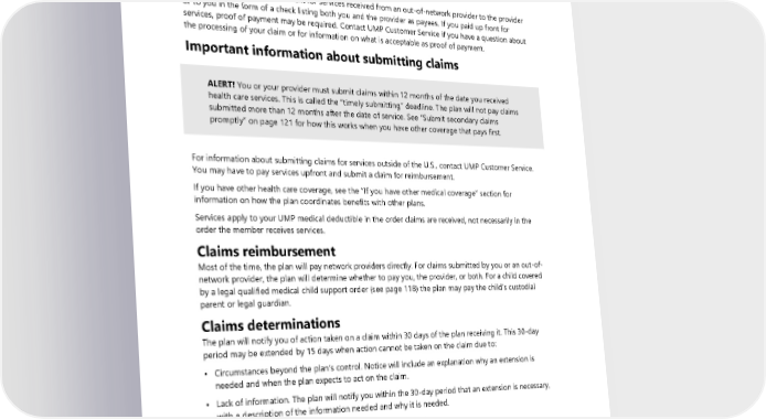 Mail both the claim form and the provider’s claim document (or bill) to: Regence BlueShield Attn: UMP Claims PO Box 1106 Lewiston, ID 83501-1106 Or you can fax documents to Regence at 1-877-357-3418. The plan may send reimbursement for services received from an out-of-network provider to the provider or to you in the form of a check listing both you and the provider as payees. If you paid up front for services, proof of payment may be required. Contact UMP Customer Service if you have a question about the processing of your claim or for information on what is acceptable as proof of payment. Important information about submitting claims ALERT! You or your provider must submit claims within 12 months of the date you received health care services. This is called the “timely submitting” deadline. The plan will not pay claims submitted more than 12 months after the date of service. See “Submit secondary claims promptly” on page 121 for how this works when you have other coverage that pays first. For information about submitting claims for services outside of the U.S., contact UMP Customer Service. You may have to pay services upfront and submit a claim for reimbursement. If you have other health care coverage, see the “If you have other medical coverage” section for information on how the plan coordinates benefits with other plans. Services apply to your UMP medical deductible in the order claims are received, not necessarily in the order the member receives services. Claims reimbursement Most of the time, the plan will pay network providers directly. For claims submitted by you or an out-of- network provider, the plan will determine whether to pay you, the provider, or both. For a child covered by a legal qualified medical child support order (see page 118) the plan may pay the child’s custodial parent or legal guardian. Claims determinations The plan will notify you of action taken on a claim within 30 days of the plan receiving it. This 30-day period may be extended by 15 days when action cannot be taken on the claim due to: • Circumstances beyond the plan’s control. Notice will include an explanation why an extension is needed and when the plan expects to act on the claim. • Lack of information. The plan will notify you within the 30-day period that an extension is necessary, with a description of the information needed and why it is needed. Submitting a claim for prescription drugs You may need to submit your own prescription drug claim to WSRxS for reimbursement if you: • Buy prescription drugs at a non-network retail pharmacy. • Fail to show your UMP member ID card at a network pharmacy. • Have other prescription coverage that pays first, and UMP is secondary. 2024 UMP Plus–UW Medicine ACN (PEBB) Certificate of Coverage 123