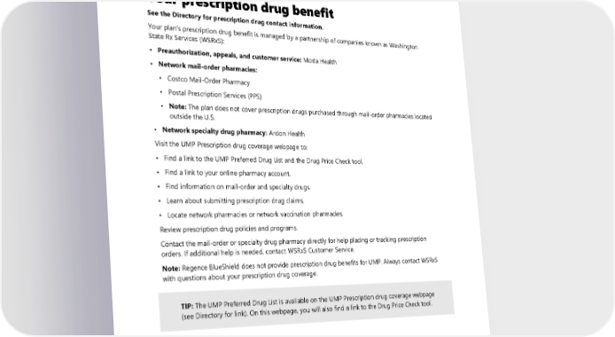 Help with your appeal: If you decide to appeal and want help with your appeal, you may have your doctor, a friend, lawyer, or someone else help you. There are several groups that can help you. If you are covered by Medicare, you may contact the Medicare Rights Center toll free at 1-888-466-9050 (TRS: 711). You may also contact the National Institute on Aging at 1-800-222-2225 (TRS: 711) to request the phone number of your local Area Agency on Aging or Health Insurance Counseling and Assistance Program (HICAP). Your prescription drug benefit See the Directory for prescription drug contact information. Your plan’s prescription drug benefit is managed by a partnership of companies known as Washington State Rx Services (WSRxS): • Preauthorization, appeals, and customer service: Moda Health • Network mail-order pharmacies: ▪ Costco Mail-Order Pharmacy ▪ Postal Prescription Services (PPS) ▪ Note: The plan does not cover prescription drugs purchased through mail-order pharmacies located outside the U.S. • Network specialty drug pharmacy: Ardon Health Visit the UMP Prescription drug coverage webpage to: • Find a link to the UMP Preferred Drug List and the Drug Price Check tool. • Find a link to your online pharmacy account. • Find information on mail-order and specialty drugs. • Learn about submitting prescription drug claims. • Locate network pharmacies or network vaccination pharmacies. Review prescription drug policies and programs. Contact the mail-order or specialty drug pharmacy directly for help placing or tracking prescription orders. If additional help is needed, contact WSRxS Customer Service. Note: Regence BlueShield does not provide prescription drug benefits for UMP. Always contact WSRxS with questions about your prescription drug coverage. TIP: The UMP Preferred Drug List is available on the UMP Prescription drug coverage webpage (see Directory for link). On this webpage, you will also find a link to the Drug Price Check tool. The UMP Preferred Drug List The UMP Preferred Drug List (sometimes called a “formulary”) lists all of the preferred drugs that UMP covers. Drugs not listed on the Preferred Drug List are not covered unless an exception is requested and approved by UMP. Excluded prescription drugs and products are not eligible for an exception. For the exception process, refer to “Requesting an exception for noncovered prescription drugs” on page 86. The UMP Preferred Drug List includes: 2024 UMP Plus–UW Medicine ACN (PEBB) Certificate of Coverage 85